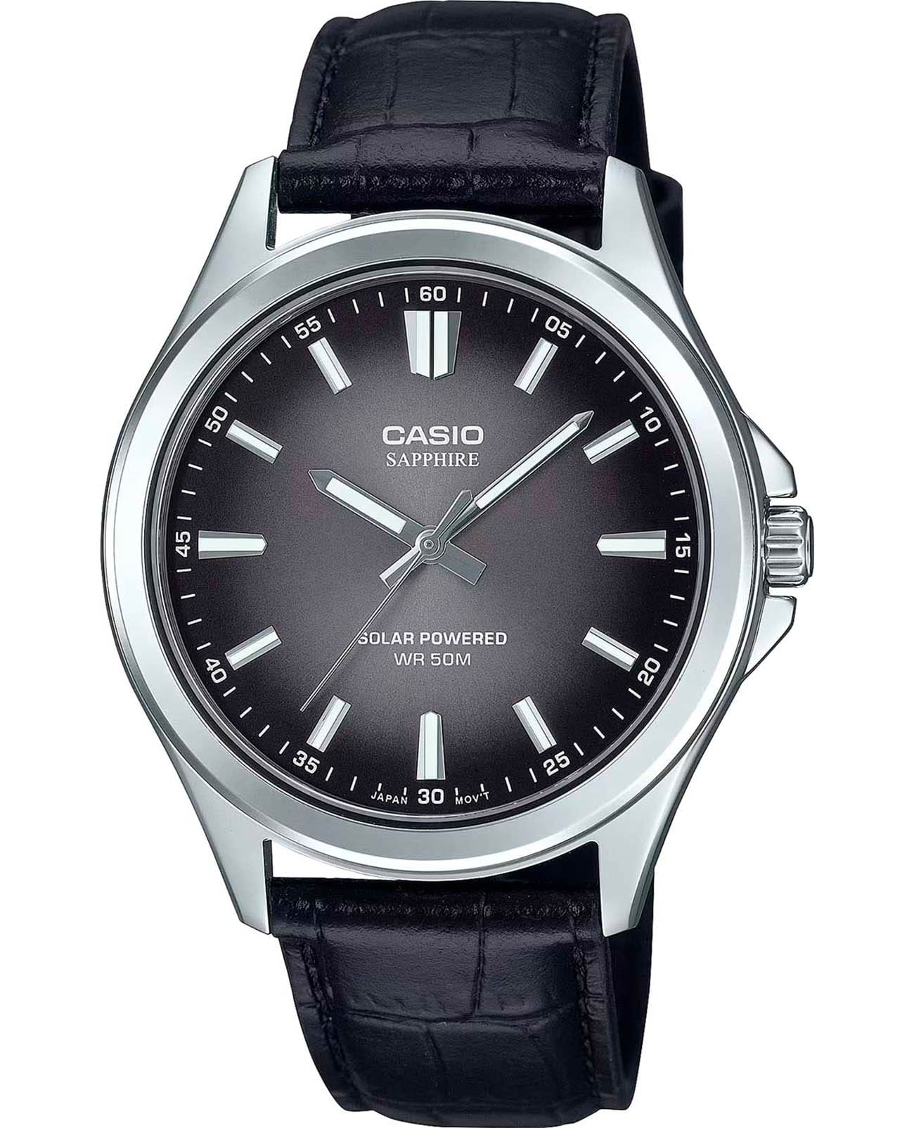 Мужские кварцевые часы Casio Collection — это современный и практичный аксессуар с питанием от солнечной энергии. Корпус размером 41,7 мм и толщиной 9,5 мм выполнен из нержавеющей стали. Циферблат чёрного цвета оформлен штрихами и стрелками. Циферблат защищён сапфировым стекломСапфировое стеклоПрочный и надёжный материал из кристалла сапфира синтетического происхождения, характеризующийся особой твёрдостью и устойчивостью к царапинам и повреждениям. с антибликовым покрытиемАнтибликовое покрытиеСлой оксида металла в 0,13-0,3 микрон, благодаря которому стекло часов не бликует и не отражает свет. Антибликовое покрытие уменьшает отражение света в 10 раз, обеспечивая отличную читаемость показателей циферблата.. Механизм — японский кварцевый калибр Miyota с центральной секундной стрелкой. Часы оснащены кожанным ремешко на стандартной пряжке. Заводная головка с защитой повышает надёжность. Водонепроницаемость 50 м позволяет использовать часы при мытье рук или в дождь. Идеальный выбор для тех, кто ценит японское качество и универсальный дизайн.
