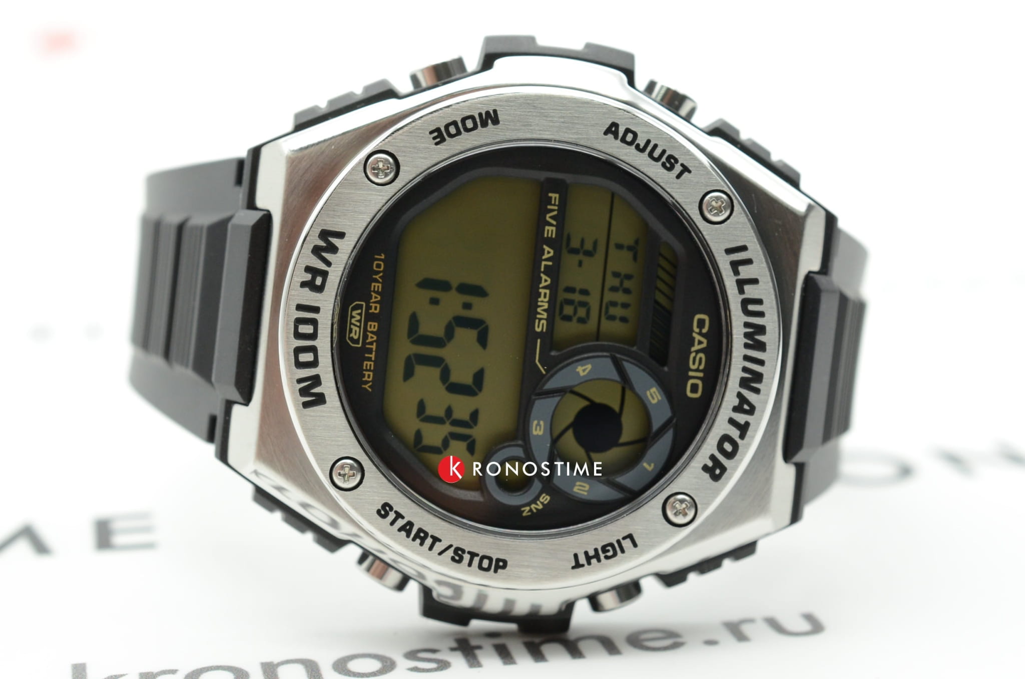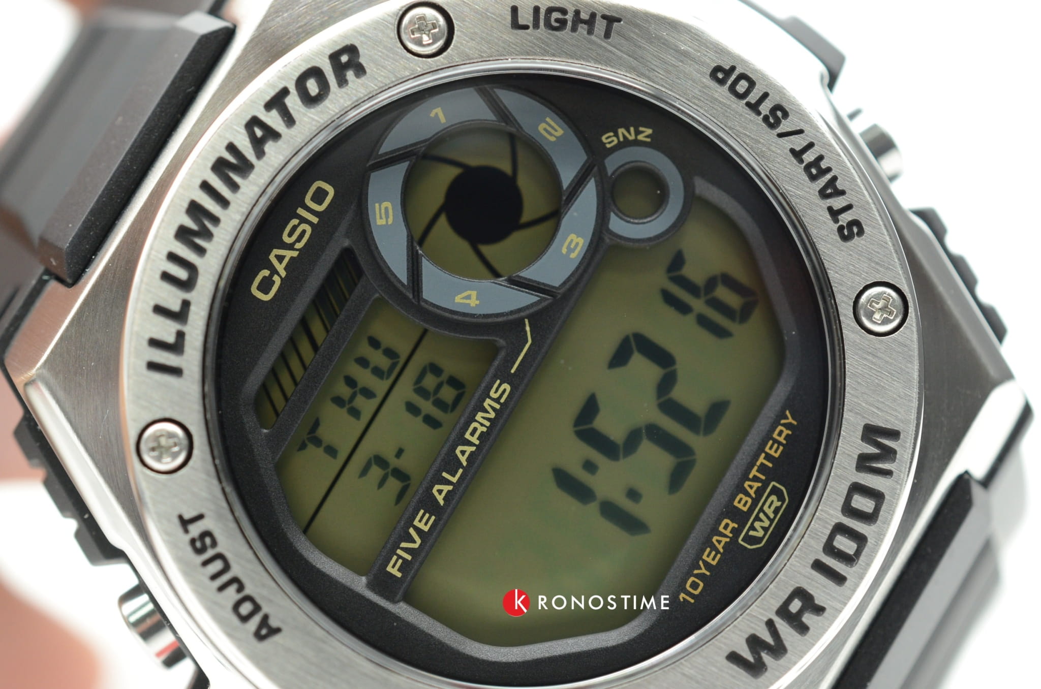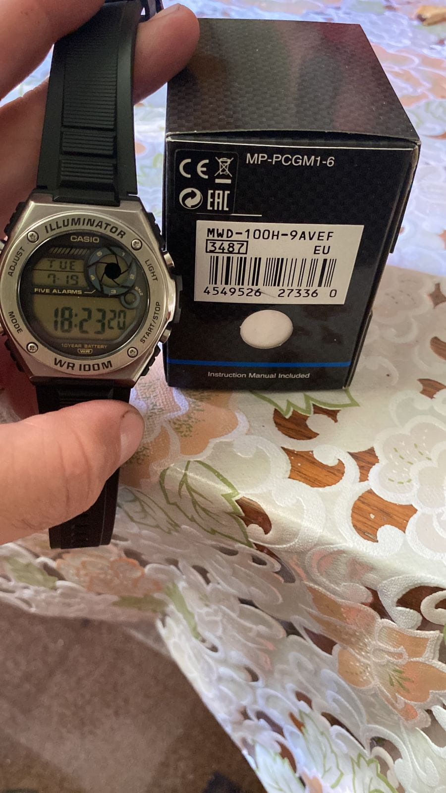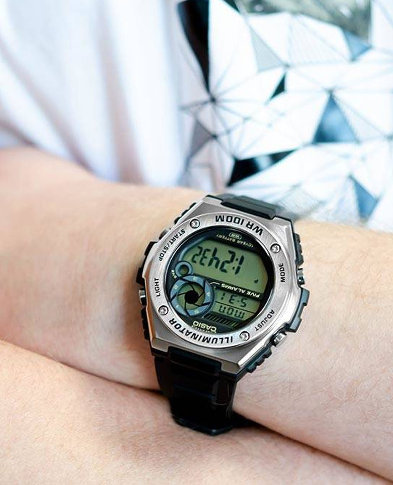 Спортивные японские мужские часы-хронографХронографФункция позволяет измерять отрезки времени с особой точностью: часы, минуты, секунды. Верным признаком хронографа является наличие на циферблате 3 дополнительных окошек-счётчиков. Casio Collection MWD-100H-9A, кварцевый механизм с высокой точностью, органическое стекло. Корпус часов изготовлен из стали и пластика. Светодиодная подсветкаСветодиодная подсветкаСветодиодная или LED-подсветка обеспечивает появление яркого холодного свечения за счёт LED-элементов - маленьких лампочек. Они потребляют минимальное количество энергии, чаще всего можно встретить 1 светодиод, в нижней части циферблата. освещает весь циферблат. Цвет подсветки: оранжевый. 12-ти и 24-х часовой формат времени. СекундомерСекундомерСекундоме́р — прибор, способный измерять интервалы времени с точностью до долей секунды. с точностью показаний 1/100с и временем измерения 1ч. Сплит-хронографСплит-хронографИспользуется для измерения продолжительности нескольких временных отрезков, начинающихся одновременно, а заканчивающихся в разное время.. Батарейка рассчитана на 10 лет. ТаймерТаймерОтсчитывает секунды в обратном направлении в заданном интервале времени. обратного отсчета от 1мин до 24ч. 5 будильниковБудильникБуди́льник — часы, в заданный момент времени подающие звуковой, световой и/или в редких случаях другой сигнал., один с функцией Snooze, ежечасный сигнал. Класс водозащиты: 100 метров, позволит плавать, нырять и заниматься другими водными видами спорта. Ремешок из полимерного материала на стандартной застежке.