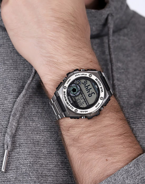 Спортивные японские мужские часы-хронографХронографФункция позволяет измерять отрезки времени с особой точностью: часы, минуты, секунды. Верным признаком хронографа является наличие на циферблате 3 дополнительных окошек-счётчиков. Casio Collection MWD-100HD-1A, кварцевый механизм с высокой точностью, органическое стекло. Корпус часов изготовлен из стали и пластика. Светодиодная подсветкаСветодиодная подсветкаСветодиодная или LED-подсветка обеспечивает появление яркого холодного свечения за счёт LED-элементов - маленьких лампочек. Они потребляют минимальное количество энергии, чаще всего можно встретить 1 светодиод, в нижней части циферблата. освещает весь циферблат. Цвет подсветки: оранжевый. 12-ти и 24-х часовой формат времени. СекундомерСекундомерСекундоме́р — прибор, способный измерять интервалы времени с точностью до долей секунды. с точностью показаний 1/100с и временем измерения 1ч. Сплит-хронографСплит-хронографИспользуется для измерения продолжительности нескольких временных отрезков, начинающихся одновременно, а заканчивающихся в разное время.. Батарейка рассчитана на 10 лет. ТаймерТаймерОтсчитывает секунды в обратном направлении в заданном интервале времени. обратного отсчета от 1мин до 24ч. 5 будильниковБудильникБуди́льник — часы, в заданный момент времени подающие звуковой, световой и/или в редких случаях другой сигнал., один с функцией Snooze, ежечасный сигнал. Класс водозащиты: 100 метров, позволит плавать, нырять и заниматься другими водными видами спорта. Стальной браслет на раскладной застёжкеРаскладная застёжкаТакой тип застёжки используется только на браслетах из металла. Она никогда не раскрывается полностью, происходит разделение на 2 и более частей. Раскладывающая застёжка снизит вероятность потери часов к минимуму..