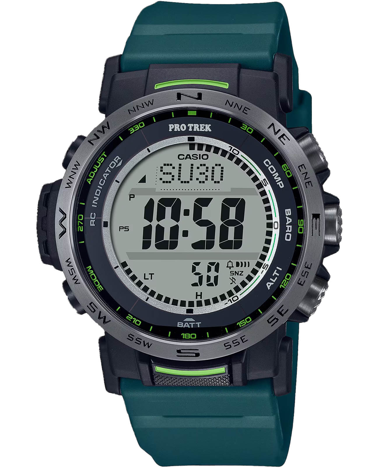 Японские мужские часы-хронографХронографФункция позволяет измерять отрезки времени с особой точностью: часы, минуты, секунды. Верным признаком хронографа является наличие на циферблате 3 дополнительных окошек-счётчиков. Casio Pro Trek PRW-35Y-3. Перед вами эволюционный релиз в линейке Pro Trek — стильная и функциональная цифровая модель из серии PRW-35 в черном полимерном корпусе с инверсионным дисплеем на мягком и прочном ремешке из биополимера. Часы созданы для путешествий, хайкинга и активного времяпровождения на природе. Минеральное стеклоМинеральное стеклоМинеральное стекло представляет собой искусственно выращенный минерал кварца. Такое стекло отличается особой устойчивостью к повреждениям и царапинам. Уступает по некоторым качествам сапфировому стеклу. устойчивое к появлению царапин, обладающее высокой прозрачностью. Корпус часов изготовлен из стали с IP-покрытиемIP-покрытиеМетод ионного напыления. Демонстрирует повышенную устойчивость к истиранию, окислению и химическим веществам. Под воздействием высокого давления и температуры около 1500°C молекулы металла надёжно соединяются с частицами корпуса часов.и биопластика, который изготавливается из возобновляемых органических ресурсов. Питание от солнечной энергии Tough SolarTough SolarТехнология основана на подзарядке аккумулятора от источника солнечного света, специальная панель улавливает солнечные лучи и преобразует их в энергию для работы часов. Достаточно пары минут нахождения на солнце для функционирования часов в течении суток.- солнечные батарейки большой мощности, индикатор заряда батареи. Функция автоматического сохранения энергии. Время работы аккумулятора без подзарядки - 6 месяцев, при включенной функции сохранения энергии - 22 месяца. Модуль часов рассчитан на работу при низких температурах до -10°С/14°F. Циферблат подсвечивается ярким светодиодомСветодиодная подсветкаСветодиодная или LED-подсветка обеспечивает появление яркого холодного свечения за счёт LED-элементов - маленьких лампочек. Они потребляют минимальное количество энергии, чаще всего можно встретить 1 светодиод, в нижней части циферблата., при недостаточном освещении во время поворота запястья в сторону лица подсветка включается автоматически. Настраиваемое послесвечение 1,5 или 3сек. Цвет подсветки: белый. 12-ти и 24-х часовой формат времени. СекундомерСекундомерСекундоме́р — прибор, способный измерять интервалы времени с точностью до долей секунды. с точностью показаний 1/10с и временем измерения 1000ч. Сплит-хронографСплит-хронографИспользуется для измерения продолжительности нескольких временных отрезков, начинающихся одновременно, а заканчивающихся в разное время.. ТаймерТаймерОтсчитывает секунды в обратном направлении в заданном интервале времени. обратного отсчета от 1мин до 24ч. Мировое времяМировое время Полезное часовое усложнение, отображающее время в основных городах и известных областях по всему миру, оно связано с часовыми поясами, удобно для путешественников и бизнесменов. – 48 городов. Переключение между домашним и мировым временем. Время восхода и захода Солнца на определенную дату. Технология Multi Band 6 позволяет принимать сигналы от шести радиовышек, расположенных в различных точках земного шара, которые передают временные сигналы от определенных атомных часов. Коррекция текущ