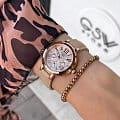 Циферблат с кристаллами, защиненный минеральным стекломМинеральное стеклоМинеральное стекло представляет собой искусственно выращенный минерал кварца. Такое стекло отличается особой устойчивостью к повреждениям и царапинам. Уступает по некоторым качествам сапфировому стеклу., идеально смотрится в сочетании с цветом розового золота, такой оттенок был получен благодаря нанесению IP-покрытияIP-покрытиеМетод ионного напыления. Демонстрирует повышенную устойчивость к истиранию, окислению и химическим веществам. Под воздействием высокого давления и температуры около 1500°C молекулы металла надёжно соединяются с частицами корпуса часов.. В качестве декорирующих элементов использованы оригинальные кристаллы Swarovski с роскошным сиянием. Корпус и браслет выполнены из долговечной стали. циферблат защинен минеральным стекломМинеральное стеклоМинеральное стекло представляет собой искусственно выращенный минерал кварца. Такое стекло отличается особой устойчивостью к повреждениям и царапинам. Уступает по некоторым качествам сапфировому стеклу.. 12-ти и 24-х часовой формат времени и число вынесены на отдельные циферблаты.