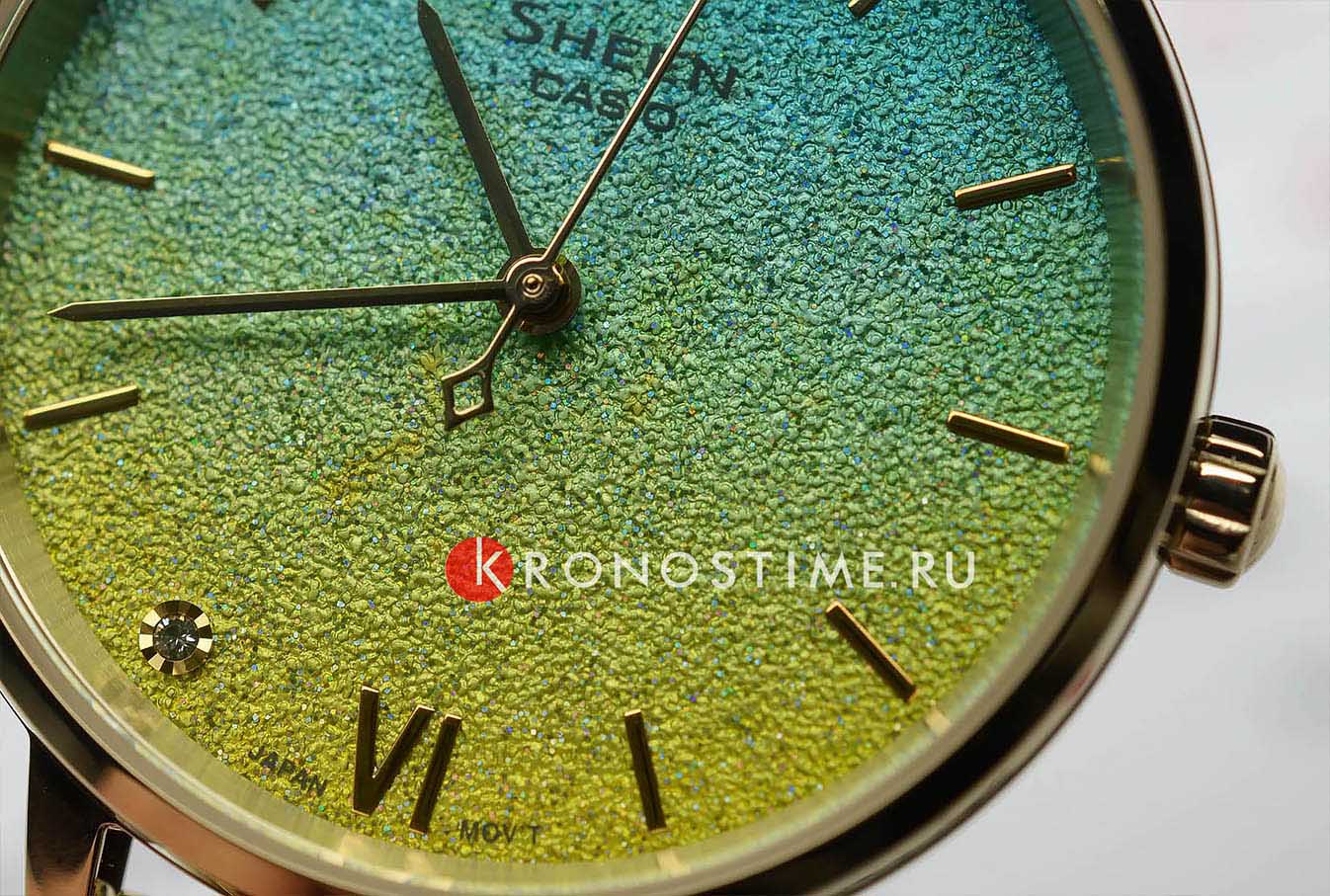 Японские женские часы Casio Sheen SHE-4548G-2A, кварцевый механизм с высокой точностью. Сапфировое стеклоСапфировое стеклоПрочный и надёжный материал из кристалла сапфира синтетического происхождения, характеризующийся особой твёрдостью и устойчивостью к царапинам и повреждениям. устойчивое к появлению царапин, обладающее высокой прозрачностью. Класс водозащиты: 50 метров, позволит защитить корпус от случайных брызг или капель дождя. Корпус часов изготовлен из стали с PVDPVDУльтратонкое покрытие наносится в технике вакуумного напыления, сочетает в себе нитрид титана особой прочности со слоем золота или оксида хрома. Несёт в себе декоративную или защитную функцию. покрытием и с раскладной застёжкойРаскладная застёжкаТакой тип застёжки используется только на браслетах из металла. Она никогда не раскрывается полностью, происходит разделение на 2 и более частей. Раскладывающая застёжка снизит вероятность потери часов к минимуму.
