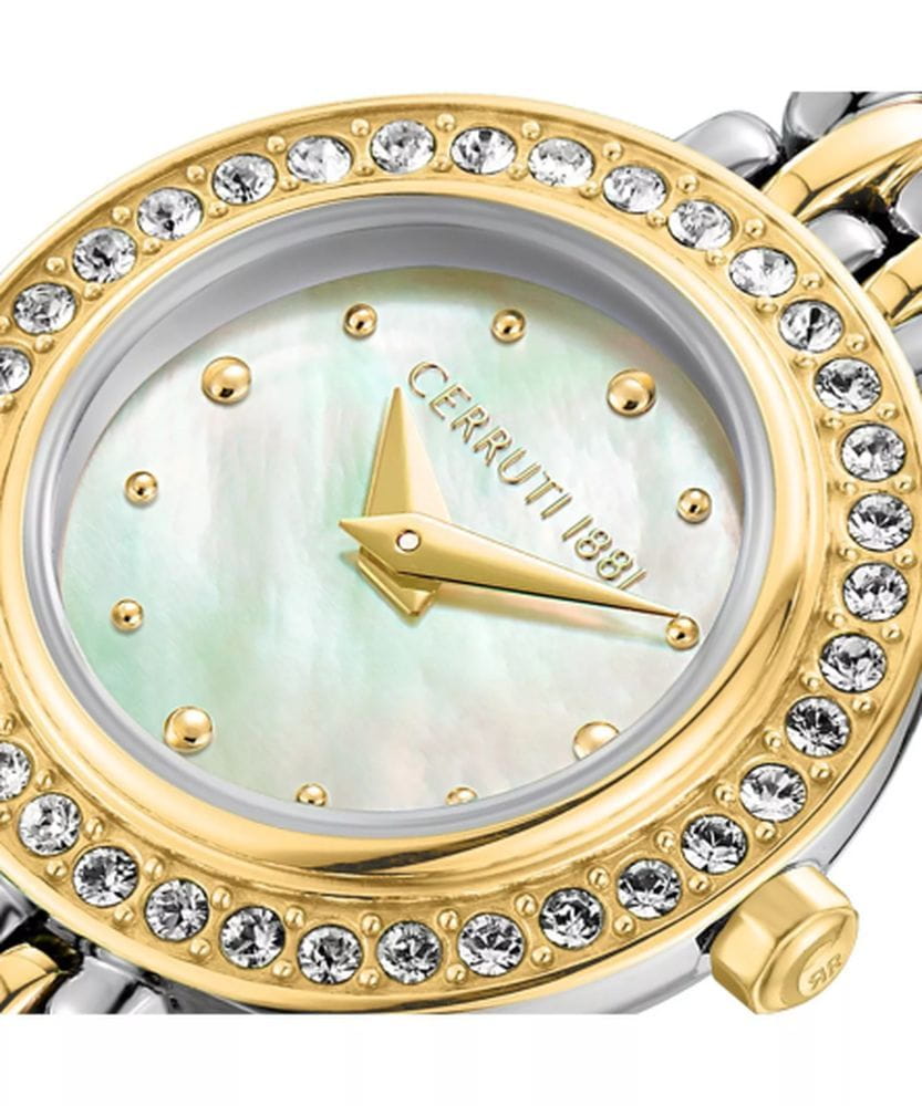 Cerruti 1881 CIWLG0073005 — изысканные женские часы, созданные в лучших традициях итальянской элегантности. Круглый корпус из нержавеющей стали и сияющим безелемБезельВнешний ободок, закрепляющий стекло. В спортивных часах так называется поворотное кольцо с делениями на циферблате, выполняет роль таймера – замеряет отрезки времени на шкале. Неподвижный безель – элемент декора. Однонаправленно вращающийся безель на дайверских часах позволяет фиксировать моменты погружения и выныривания на поверхность. с IP-покрытиемIP-покрытиеМетод ионного напыления. Демонстрирует повышенную устойчивость к истиранию, окислению и химическим веществам. Под воздействием высокого давления и температуры около 1500°C молекулы металла надёжно соединяются с частицами корпуса часов. , украшенным кристаллами, придаёт модели утончённый и праздничный вид. Глубокий циферблат с солнечным переливом оформлен лаконично и стильно: миниатюрные метки в виде кристаллов подчёркивают ювелирный характер аксессуара. Прочное минеральное стеклоМинеральное стеклоМинеральное стекло представляет собой искусственно выращенный минерал кварца. Такое стекло отличается особой устойчивостью к повреждениям и царапинам. Уступает по некоторым качествам сапфировому стеклу. защищает поверхность от царапин, а металлический браслет с частичным IP-покрытиемIP-покрытиеМетод ионного напыления. Демонстрирует повышенную устойчивость к истиранию, окислению и химическим веществам. Под воздействием высокого давления и температуры около 1500°C молекулы металла надёжно соединяются с частицами корпуса часов. полированными звеньями оснащён застёжкой «бабочка»Застёжка "бабочка"Такой вид застёжки дополняется предохранителями, помогающими избежать случайного раскрытия браслета. Обладают изящным исполнением. , обеспечивающей комфортное прилегание и надёжную фиксацию. Cerruti 1881 — это воплощение женственности и роскоши, идеально подходящее для тех, кто ценит утончённый стиль и блеск итальянской моды.
