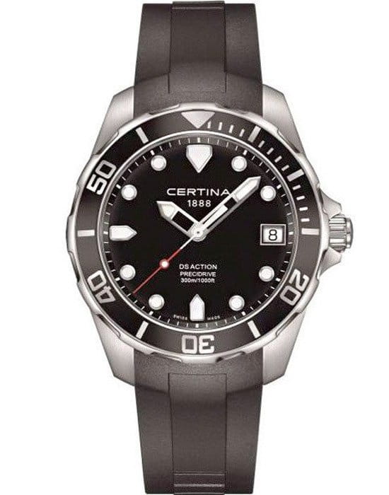Наручные часы представляют собой настоящий шедевр, безупречно всё: от продуманного дизайна до высокого качества исполнения. Швейцарский кварцевый механизм ETA F07.411 Precidrive™Precidrive™Инновационный кварцевый механизм Certina. Часы, оснащённые этим швейцарским калибром, приравниваются к точности к сертифицированным хронометрам, точность хода составляет +/-10 секунд в год. демонстрирует максимальную точность хода. Сапфировое стекло с антибликовой поверхностью. Односторонне вращающийся безельБезельВнешний ободок, закрепляющий стекло. В спортивных часах так называется поворотное кольцо с делениями на циферблате, выполняет роль таймера – замеряет отрезки времени на шкале. Неподвижный безель – элемент декора. Однонаправленно вращающийся безель на дайверских часах позволяет фиксировать моменты погружения и выныривания на поверхность.. Реализация концепции Double SecurityDS ConceptDouble Security Concept, обозначает двойную надёжность и безупречную точность часов Certina. Двойная система защиты подразумевает обеспечение максимальной устойчивости к ударам и высоких показателей водонепроницаемости.. Водонепроницаемость при давлении до 30 бар. Каучуковый ремешок. Застёжка с фиксатором и удлинением для дайверовУдлинение для дайверовЗастёжка с удлинением для дайверов представляет собой безопасное крепление, которое позволяет надевать часы поверх гидрокостюма. Гибкая застёжка удлиняется на 1-2 миллиметра.. Яркая люминесцентная подсветкаЛюминесцентное покрытиеПозволяет считывать показания времени в темноте. Производители наносят на стрелки, часовые индексы, безель или поверхность циферблата светонакопительный состав, дающий холодное свечение.. Окошко даты, индикатор EOL. Диаметр корпуса: 41 мм.