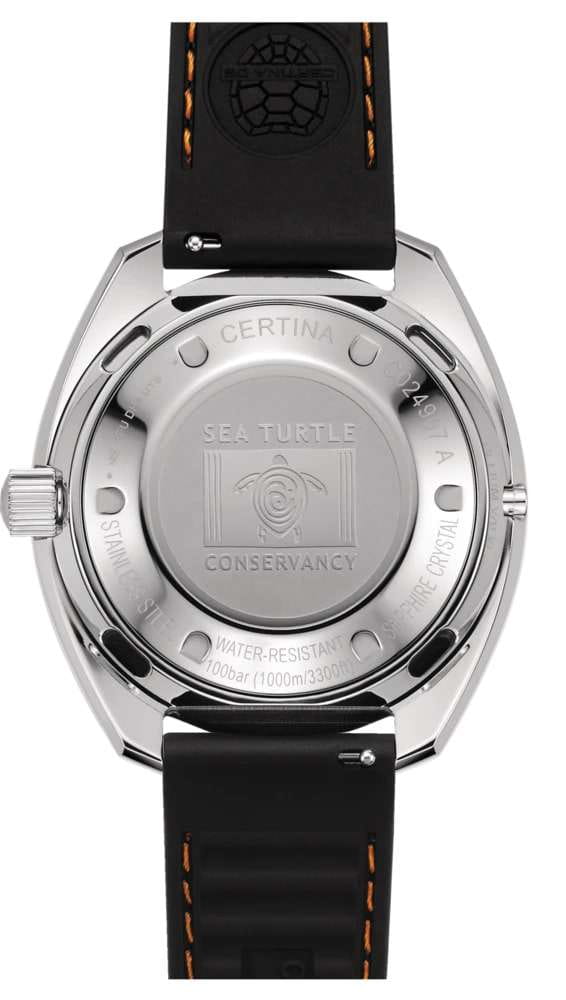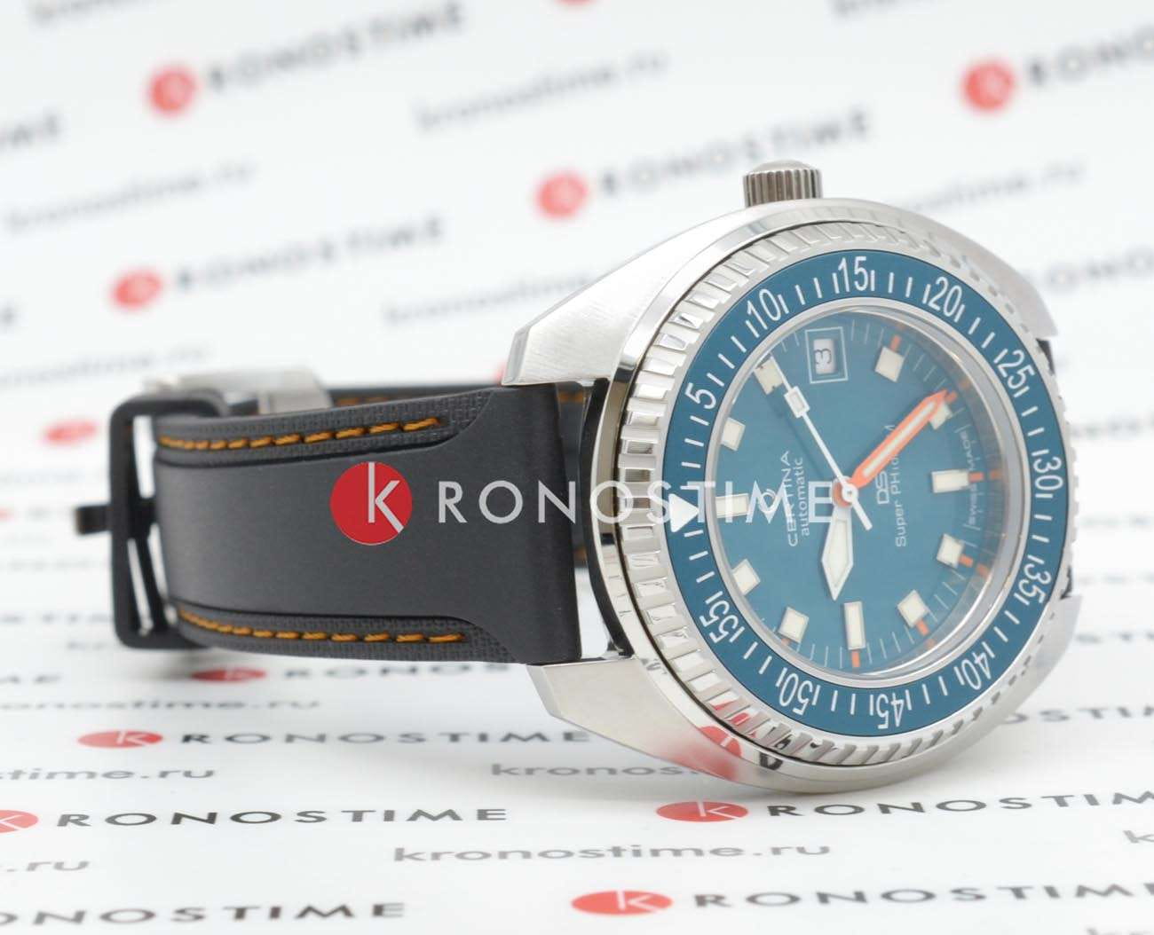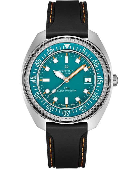 Certina DS SUPER PH1000M STC C024.907.17.041.10 – часы для поклонников ярких аксессуаров. Корпус изготовлен из высококачественной нержавеющей стали 316L с . Под твердым сапфировым стекломСапфировое стеклоПрочный и надёжный материал из кристалла сапфира синтетического происхождения, характеризующийся особой твёрдостью и устойчивостью к царапинам и повреждениям. с антибликовым покрытиемАнтибликовое покрытиеСлой оксида металла в 0,13-0,3 микрон, благодаря которому стекло часов не бликует и не отражает свет. Антибликовое покрытие уменьшает отражение света в 10 раз, обеспечивая отличную читаемость показателей циферблата. находится бирюзовый циферблат на котором вы найдете окошко даты в положении 3 часа, а также маркировку, покрытую люминесцентным покрытиемЛюминесцентное покрытиеПозволяет считывать показания времени в темноте. Производители наносят на стрелки, часовые индексы, безель или поверхность циферблата светонакопительный состав, дающий холодное свечение. Super-LumiNova. Все это приводится в действие автоматическим механизмом Powermatic 80Powermatic 80Эксклюзивный калибр от швейцарской компании ETA с увеличенным запасом хода до 80 часов за счёт удлинённой заводной пружины. Характеризуется улучшенной системой спуска со сниженным трением..611 с пружиной Nivachron™Nivachron™Специально разработанный инновационный сплав Nivachron™ повышает устойчивость часов к воздействию магнитных полей.. Класс водозащиты: 1000 метров, позволит плавать, нырять и заниматься другими водными видами спорта. Кожаный ремешок. БезельБезельВнешний ободок, закрепляющий стекло. В спортивных часах так называется поворотное кольцо с делениями на циферблате, выполняет роль таймера – замеряет отрезки времени на шкале. Неподвижный безель – элемент декора. Однонаправленно вращающийся безель на дайверских часах позволяет фиксировать моменты погружения и выныривания на поверхность. из нержавеющей стали с IP-покрытиемIP-покрытиеМетод ионного напыления. Демонстрирует повышенную устойчивость к истиранию, окислению и химическим веществам. Под воздействием высокого давления и температуры около 1500°C молекулы металла надёжно соединяются с частицами корпуса часов..