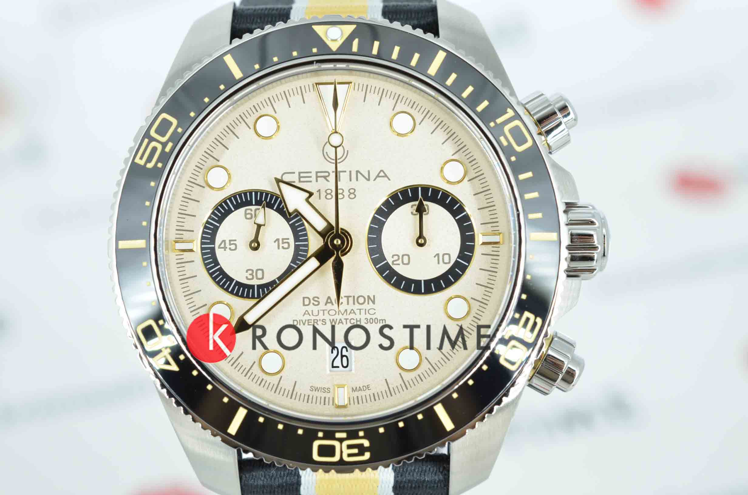 Коллекция DS Action открывает новые «глубины» часового искусства в прямом смысле этого слова: эти «морские» часы в стиле унисекс отличаются точностью, исключительной водостойкостью и динамичным дизайном – идеальный выбор для любой ситуации. Швейцарские мужские механические часы Certina DS Action Diver Chrono C032.827.18.271.00 из коллекции DS Action – безупречно точный и впечатляюще надёжный аксессуар. Габаритный хронографХронографФункция позволяет измерять отрезки времени с особой точностью: часы, минуты, секунды. Верным признаком хронографа является наличие на циферблате 3 дополнительных окошек-счётчиков. с бежевым циферблатом выгодно подчеркнёт повседневный или деловой образ. Модель соответствует стандарту ISO 6425 для дайверских часов и может похвастаться повышенной водостойкостью до 30 бар. Заводная головка, кнопки и задняя крышка завинчиваются для дополнительной герметичности. Аксессуар позволит вам чувствовать себя на высоте и в воде, и на суше. Сапфировое стеклоСапфировое стеклоПрочный и надёжный материал из кристалла сапфира синтетического происхождения, характеризующийся особой твёрдостью и устойчивостью к царапинам и повреждениям. с двухсторонней антибликовой обработкой. Керамический вращающийся безельБезельВнешний ободок, закрепляющий стекло. В спортивных часах так называется поворотное кольцо с делениями на циферблате, выполняет роль таймера – замеряет отрезки времени на шкале. Неподвижный безель – элемент декора. Однонаправленно вращающийся безель на дайверских часах позволяет фиксировать моменты погружения и выныривания на поверхность.. Корпус из нержавеющей стали 316L. Люминесцентная подсветкаЛюминесцентное покрытиеПозволяет считывать показания времени в темноте. Производители наносят на стрелки, часовые индексы, безель или поверхность циферблата светонакопительный состав, дающий холодное свечение.. Календарь, секундомер. Тканевый ремешок. Диаметр корпуса: 44,6 мм. Производство и сборка: Швейцария.