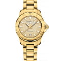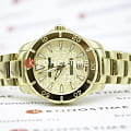 Certina DS Action Lady C032.951.33.361.00 из коллекции DS Action символизируют любовь бренда к водной стихии и высокоточным механизмам. Компактный аксессуар создан по всем правилам дайверской тематики: вращающийся безельБезельВнешний ободок, закрепляющий стекло. В спортивных часах так называется поворотное кольцо с делениями на циферблате, выполняет роль таймера – замеряет отрезки времени на шкале. Неподвижный безель – элемент декора. Однонаправленно вращающийся безель на дайверских часах позволяет фиксировать моменты погружения и выныривания на поверхность., крупная индикация времени, завинчивающаяся заводная головка и задняя крышка. Стильно смотрится золотистый циферблат в сочетании с холодным блеском нержавеющей стали 316L с PVD-покрытиемPVDУльтратонкое покрытие наносится в технике вакуумного напыления, сочетает в себе нитрид титана особой прочности со слоем золота или оксида хрома. Несёт в себе декоративную или защитную функцию.. Часы оснащены швейцарским кварцевым калибром ETA F04.412 Precidrive™Precidrive™Инновационный кварцевый механизм Certina. Часы, оснащённые этим швейцарским калибром, приравниваются к точности к сертифицированным хронометрам, точность хода составляет +/-10 секунд в год., точность хода которого отмечена официальным сертификатом COSCСертификат COSCОфициальный сертификат, подтверждающий то, что часы ходят с особо высокой точностью. Для получения документа часы подвергаются тестовым испытаниям, разработанным швейцарским институтом тестирования хронометров COSC. Допустимая норма для механических часов -4/+6 секунд в день, для кварцевых моделей +/- 0,07 секунд в день.. Модель отличается максимальной водонепроницаемостью 200 метров, сапфировое стекло дополнено антибликовым покрытием. Функции: отображение даты, индикатор EOLEOLПредставляет собой систему, уведомляющую владельца часов о необходимости замены элемента питания. За 2 недели до полного разряда батарейки секундная стрелка перестаёт ходить чётко и начинает перепрыгивать на 3-4 деления.. Диаметр корпуса: 29 мм. Производство и сборка: Швейцария.