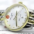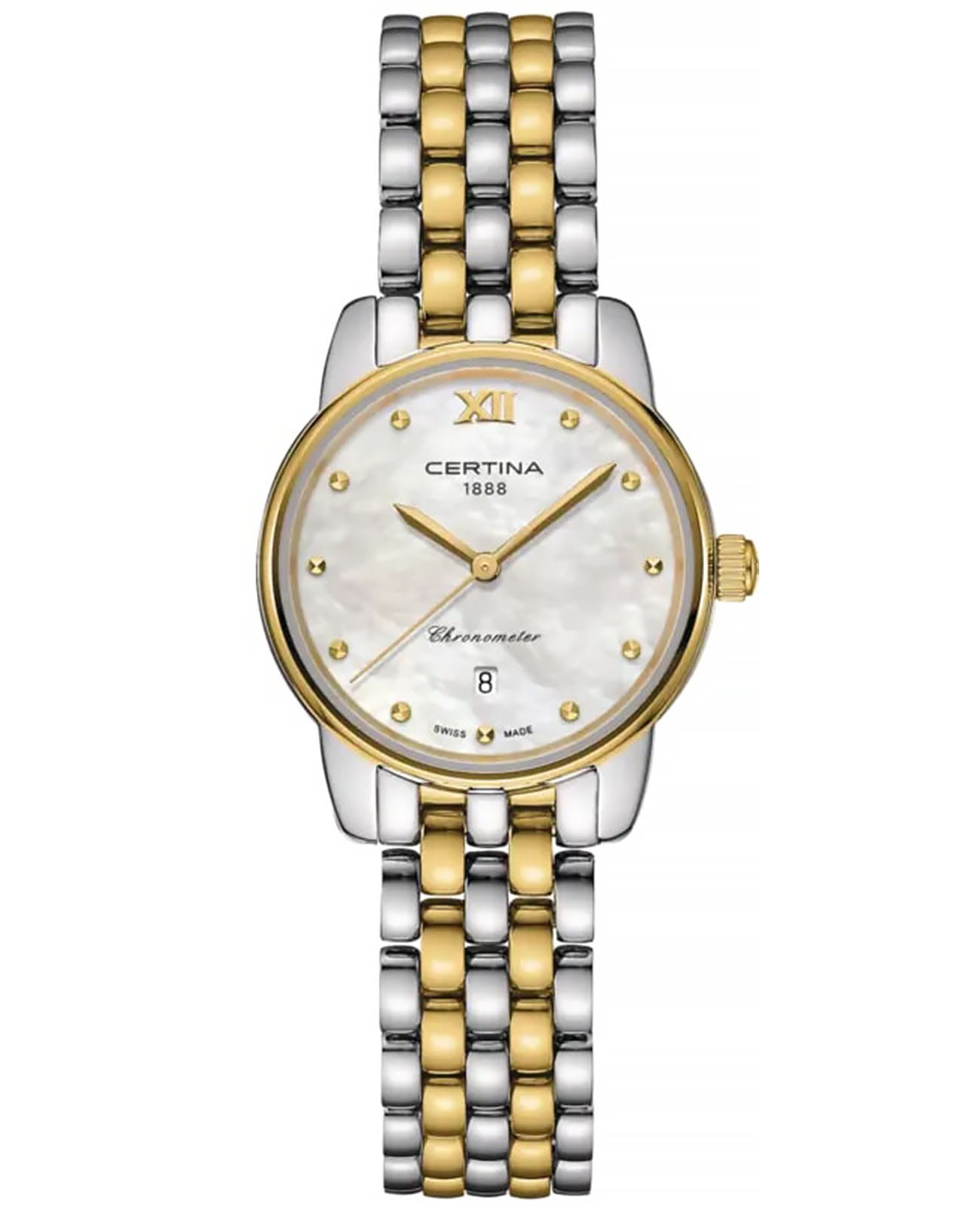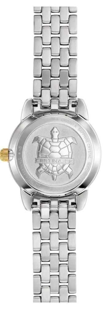 Изысканный аксессуар – лучший вариант для делового костюма или вечернего наряда. Эффектный перламутровый циферблат, бело-серого цвета дополнен незатейливым узором и золотистой часовой разметкой. Часы привлекают не только дизайном, но и абсолютной точностью: швейцарский кварцевый механизм ETA F03.412 Precidrive™Precidrive™Инновационный кварцевый механизм Certina. Часы, оснащённые этим швейцарским калибром, приравниваются к точности к сертифицированным хронометрам, точность хода составляет +/-10 секунд в год. удостоился официального сертификата COSCСертификат COSCОфициальный сертификат, подтверждающий то, что часы ходят с особо высокой точностью. Для получения документа часы подвергаются тестовым испытаниям, разработанным швейцарским институтом тестирования хронометров COSC. Допустимая норма для механических часов -4/+6 секунд в день, для кварцевых моделей +/- 0,07 секунд в день.. Система DS ConceptDS ConceptDouble Security Concept, обозначает двойную надёжность и безупречную точность часов Certina. Двойная система защиты подразумевает обеспечение максимальной устойчивости к ударам и высоких показателей водонепроницаемости.. Противокоррозионная сталь 316L с PVD-покрытиемPVDУльтратонкое покрытие наносится в технике вакуумного напыления, сочетает в себе нитрид титана особой прочности со слоем золота или оксида хрома. Несёт в себе декоративную или защитную функцию.. Степень водозащиты WR 100. Сапфировое стеклоСапфировое стеклоПрочный и надёжный материал из кристалла сапфира синтетического происхождения, характеризующийся особой твёрдостью и устойчивостью к царапинам и повреждениям. с антибликовой обработкой. Застёжка «бабочка» с кнопкамиЗастёжка "бабочка"Такой вид застёжки дополняется предохранителями, помогающими избежать случайного раскрытия браслета. Обладают изящным исполнением. . Отображение числа, индикатор EOLEOLПредставляет собой систему, уведомляющую владельца часов о необходимости замены элемента питания. За 2 недели до полного разряда батарейки секундная стрелка перестаёт ходить чётко и начинает перепрыгивать на 3-4 деления.. Диаметр корпуса: 27,5 мм.