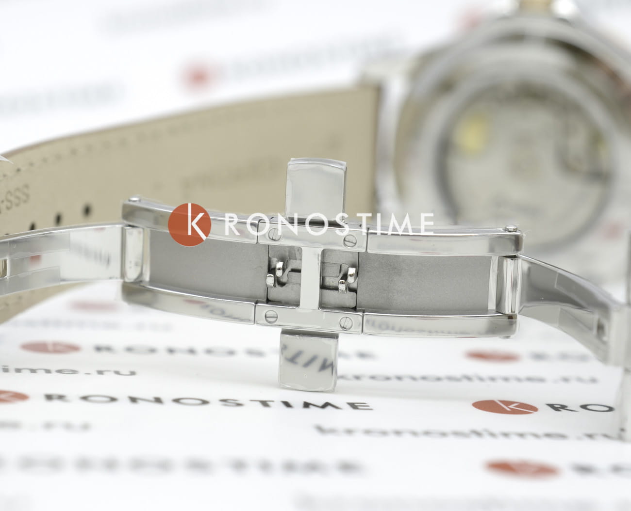 Корпус часов выполнен из высококачественной нержавеющей стали, что обеспечивает их долговечность и стойкость к механическим повреждениям. БезельБезельВнешний ободок, закрепляющий стекло. В спортивных часах так называется поворотное кольцо с делениями на циферблате, выполняет роль таймера – замеряет отрезки времени на шкале. Неподвижный безель – элемент декора. Однонаправленно вращающийся безель на дайверских часах позволяет фиксировать моменты погружения и выныривания на поверхность. с PVD-покрытиемPVDУльтратонкое покрытие наносится в технике вакуумного напыления, сочетает в себе нитрид титана особой прочности со слоем золота или оксида хрома. Несёт в себе декоративную или защитную функцию. придает часам дополнительную элегантность и защиту от износа. Стрелки с люминесцентным покрытиемЛюминесцентное покрытиеПозволяет считывать показания времени в темноте. Производители наносят на стрелки, часовые индексы, безель или поверхность циферблата светонакопительный состав, дающий холодное свечение. делают часы привлекательными и хорошо видимыми в условиях слабого освещения. Окошко даты, расположенное на отметке 3 часа, позволяет быстро и удобно узнавать текущее число.
