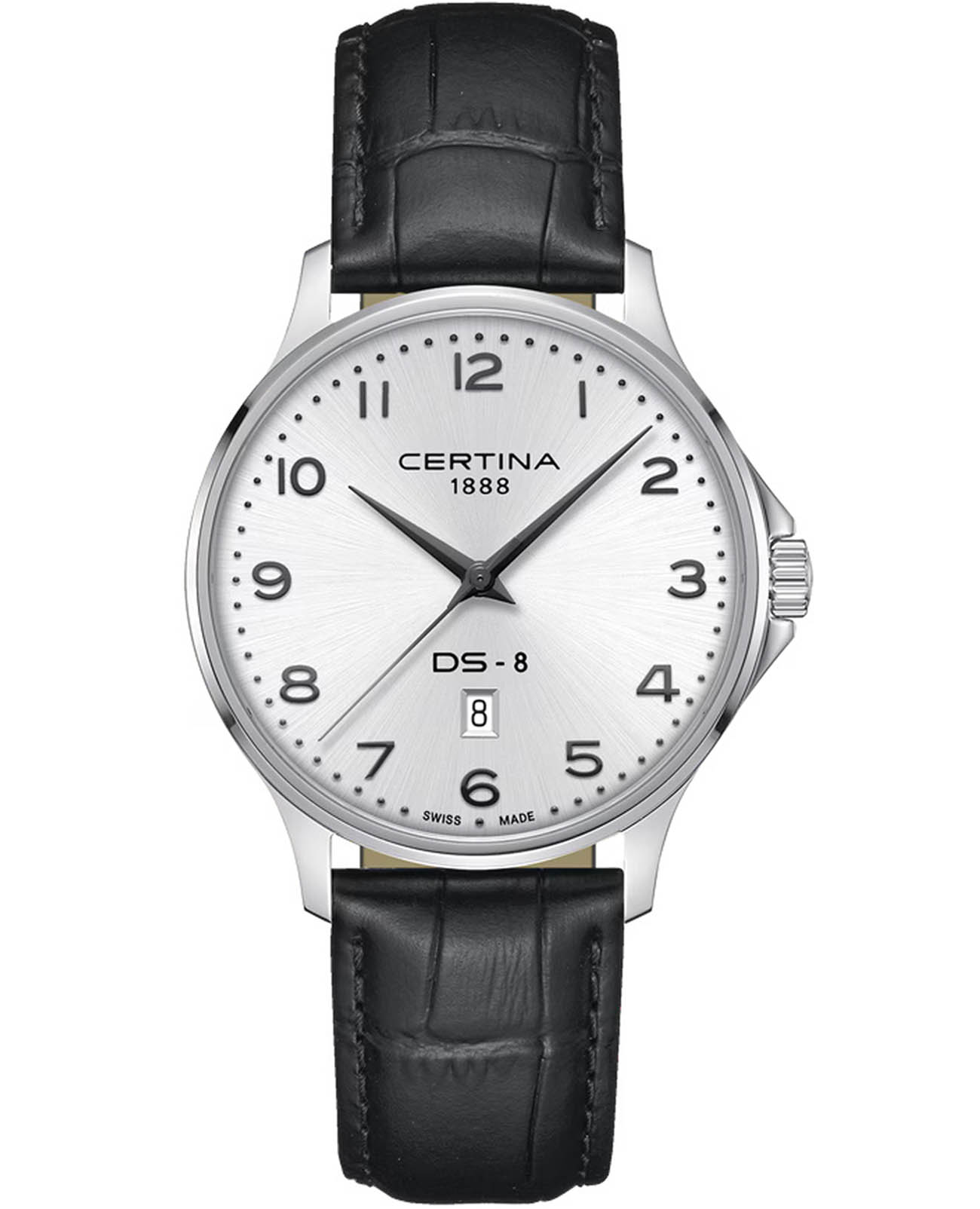 Швейцарские часы Certina DS-8 Gent C045.410.16.032.00 станут оригинальным дополнением повседневного образа. Часы с кварцевым механизмом с Precidrive™Precidrive™Инновационный кварцевый механизм Certina. Часы, оснащённые этим швейцарским калибром, приравниваются к точности к сертифицированным хронометрам, точность хода составляет +/-10 секунд в год.. Поверхность корпуса защищена сапфировым стекломСапфировое стеклоПрочный и надёжный материал из кристалла сапфира синтетического происхождения, характеризующийся особой твёрдостью и устойчивостью к царапинам и повреждениям. с антибликовым покрытиемАнтибликовое покрытиеСлой оксида металла в 0,13-0,3 микрон, благодаря которому стекло часов не бликует и не отражает свет. Антибликовое покрытие уменьшает отражение света в 10 раз, обеспечивая отличную читаемость показателей циферблата., устойчивым к царапинам и механическим повреждениям. Водостойкость 100 метров. Корпус из стали 316L с противокоррозионными свойствами. Браслет из кожи со стандартной застежкой. Функция EOLEOLПредставляет собой систему, уведомляющую владельца часов о необходимости замены элемента питания. За 2 недели до полного разряда батарейки секундная стрелка перестаёт ходить чётко и начинает перепрыгивать на 3-4 деления., отображение текущего числа. Диаметр корпуса: 40 мм.