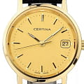 Женские швейцарские часы Certina PRISKA GOLD C158.9289.68.31. Золотой циферблат соединен с корпусом из 18-каратного желтого золота. Идеальным дополнением станет черный ремешок из натуральной кожи. За точное измерение времени отвечает швейцарский кварцевый механизм ETA 256.111 с аккумулятором EOL. Инновационная прокладка из биоматериала обеспечивает идеальное уплотнение. Наряду с часовой, минутной и секундной стрелками часы имеют окошко даты на отметке «3 часа». Водозащита 30 метров, позволит защитить корпус от случайных брызг или капель дождя. Сапфировое стеклоСапфировое стеклоПрочный и надёжный материал из кристалла сапфира синтетического происхождения, характеризующийся особой твёрдостью и устойчивостью к царапинам и повреждениям. устойчивое к появлению царапин, обладающее высокой прозрачностью. Браслет из натуральной кожи сочетает в себе стиль и долговечность. Стрелки с люминесцентным покрытиемЛюминесцентное покрытиеПозволяет считывать показания времени в темноте. Производители наносят на стрелки, часовые индексы, безель или поверхность циферблата светонакопительный состав, дающий холодное свечение..