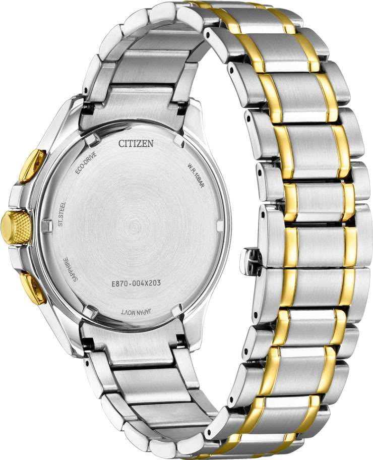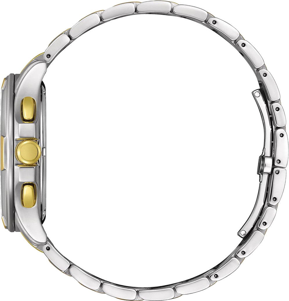 Часы Citizen BL8164-57E сочетают в себе передовые технологии и элегантный дизайн, идеально подходя для современного делового мужчины. Корпус и браслет выполнены из прочной нержавеющей стали, а на безельБезельВнешний ободок, закрепляющий стекло. В спортивных часах так называется поворотное кольцо с делениями на циферблате, выполняет роль таймера – замеряет отрезки времени на шкале. Неподвижный безель – элемент декора. Однонаправленно вращающийся безель на дайверских часах позволяет фиксировать моменты погружения и выныривания на поверхность. с браслетом частично нанесено золотистое IP-покрытиеIP-покрытиеМетод ионного напыления. Демонстрирует повышенную устойчивость к истиранию, окислению и химическим веществам. Под воздействием высокого давления и температуры около 1500°C молекулы металла надёжно соединяются с частицами корпуса часов.. Графитовый циферблат украшен метками в виде штрихов, к тому же стрелки и метки с люминесцентным покрытиемЛюминесцентное покрытиеПозволяет считывать показания времени в темноте. Производители наносят на стрелки, часовые индексы, безель или поверхность циферблата светонакопительный состав, дающий холодное свечение., что обеспечивает отличную читаемость в любое время суток. Модель оснащена инновационной системой Eco-Drive, которая работает на солнечной энергии и не требует замены батарейки, а запас хода составляет до 210 дней, при включенной функции энергосбережения — до 18 месяцев. Надежный кварцевый механизм Citizen E870 поддерживает функции вечного календаря с отображением числа, дня недели и месяца, а также индикацию второго часового поясаВторой часовой поясФункция, позволяющая отображать время двух часовых поясов одновременно. и будильникБудильникБуди́льник — часы, в заданный момент времени подающие звуковой, световой и/или в редких случаях другой сигнал.. Окошко даты расположено в положении 4 часа, ретроградный указатель дня недели вынесен на отдельный циферблат, а месяц отображается центральной стрелкой. Для дополнительного удобства предусмотрены 12- и 24-часовой форматы времени, функция индикации заряда EOLEOLПредставляет собой систему, уведомляющую владельца часов о необходимости замены элемента питания. За 2 недели до полного разряда батарейки секундная стрелка перестаёт ходить чётко и начинает перепрыгивать на 3-4 деления. и система предотвращения перезарядки. Заводная головка снабжена защитой, а браслет оснащен раскладной застёжкойРаскладная застёжкаТакой тип застёжки используется только на браслетах из металла. Она никогда не раскрывается полностью, происходит разделение на 2 и более частей. Раскладывающая застёжка снизит вероятность потери часов к минимуму., обеспечивая надежную фиксацию на руке. Сапфировое стеклоСапфировое стеклоПрочный и надёжный материал из кристалла сапфира синтетического происхождения, характеризующийся особой твёрдостью и устойчивостью к царапинам и повреждениям. эффективно защищает циферблат от царапин, а водозащита 100WR позволяет использовать часы даже во время плавания. Диаметр корпуса составляет 42 мм, толщина — 11,1 мм, что делает модель стильной и удобной для ежедневного ношения.