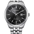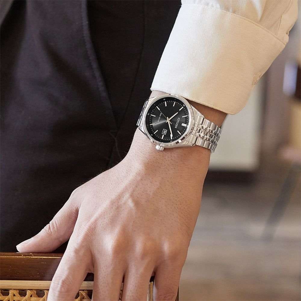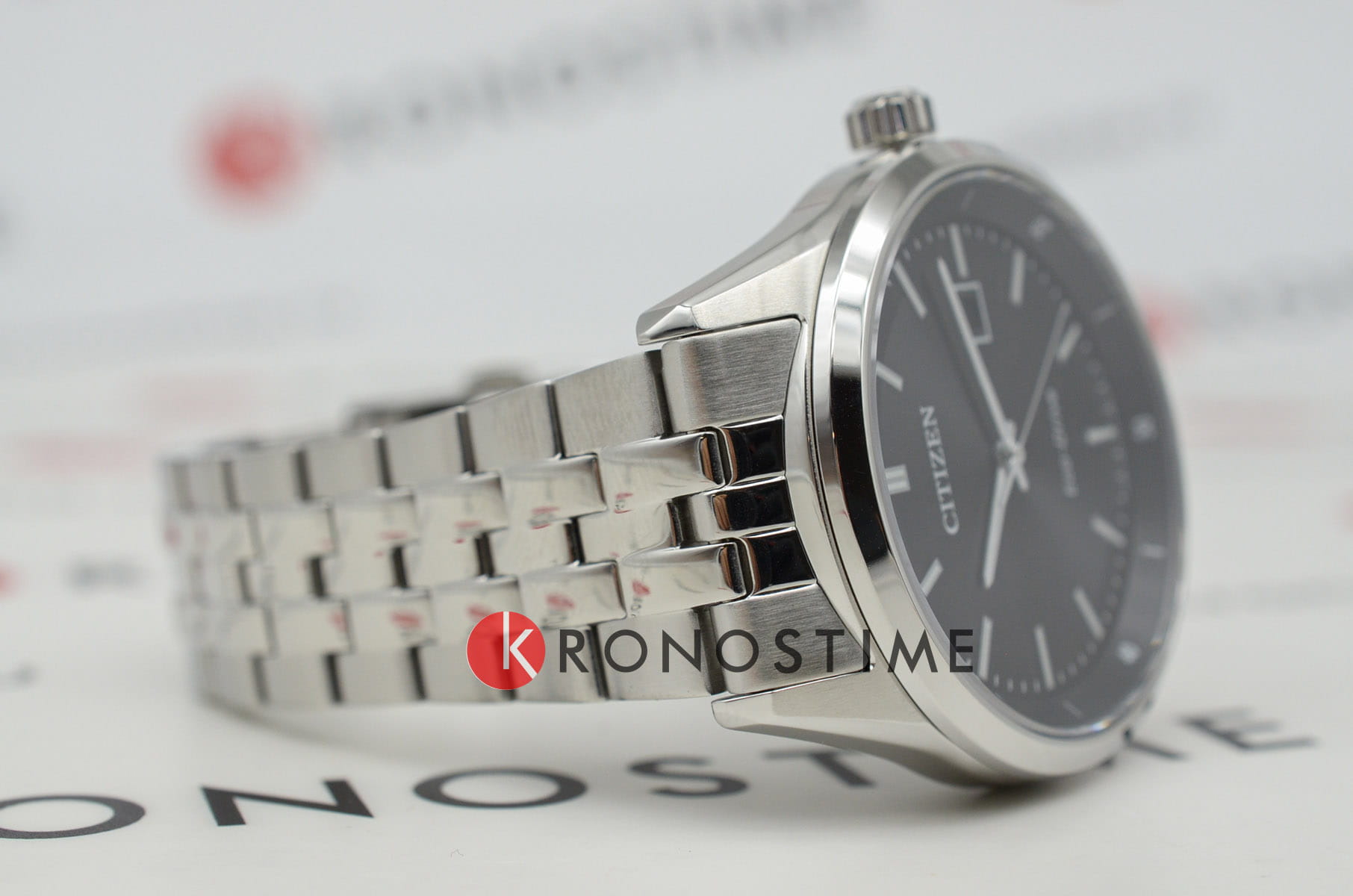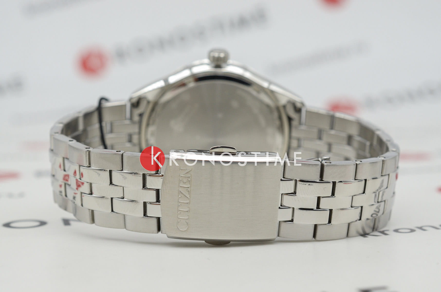 Citizen BM7560-59E — элегантные японские часы с современным дизайном, созданные для ценителей надежности и практичности. Эта модель оснащена высокоточным кварцевым механизмом и инновационной системой Eco-Drive, которая обеспечивает питание от солнечной энергии и избавляет от необходимости замены батарейки, а запас хода достигает 180 дней. Корпус и браслет выполнены из нержавеющей стали, что гарантирует прочность и долговечность изделия. Сапфировое стеклоСапфировое стеклоПрочный и надёжный материал из кристалла сапфира синтетического происхождения, характеризующийся особой твёрдостью и устойчивостью к царапинам и повреждениям. устойчиво к появлению царапин и мелких повреждений, надежно защищая черный циферблат с лаконичными часовыми индексами в виде штрихов. Центральные стрелки показывают часы, минуты и секунды, а функция индикации даты делает использование часов ещё более удобным. Стрелки с люминесцентным покрытиемЛюминесцентное покрытиеПозволяет считывать показания времени в темноте. Производители наносят на стрелки, часовые индексы, безель или поверхность циферблата светонакопительный состав, дающий холодное свечение. удобно подсвечиваются в темноте после зарядки на свету. Браслет из нержавеющей стали оснащен раскладной застёжкойРаскладная застёжкаТакой тип застёжки используется только на браслетах из металла. Она никогда не раскрывается полностью, происходит разделение на 2 и более частей. Раскладывающая застёжка снизит вероятность потери часов к минимуму., обеспечивая надежную фиксацию на руке. Водозащита уровня WR 100 позволяет не снимать часы во время плавания без погружения. Диаметр корпуса составляет 41 мм, толщина — 10 мм, благодаря чему модель отлично смотрится на запястье и подходит для повседневного ношения.