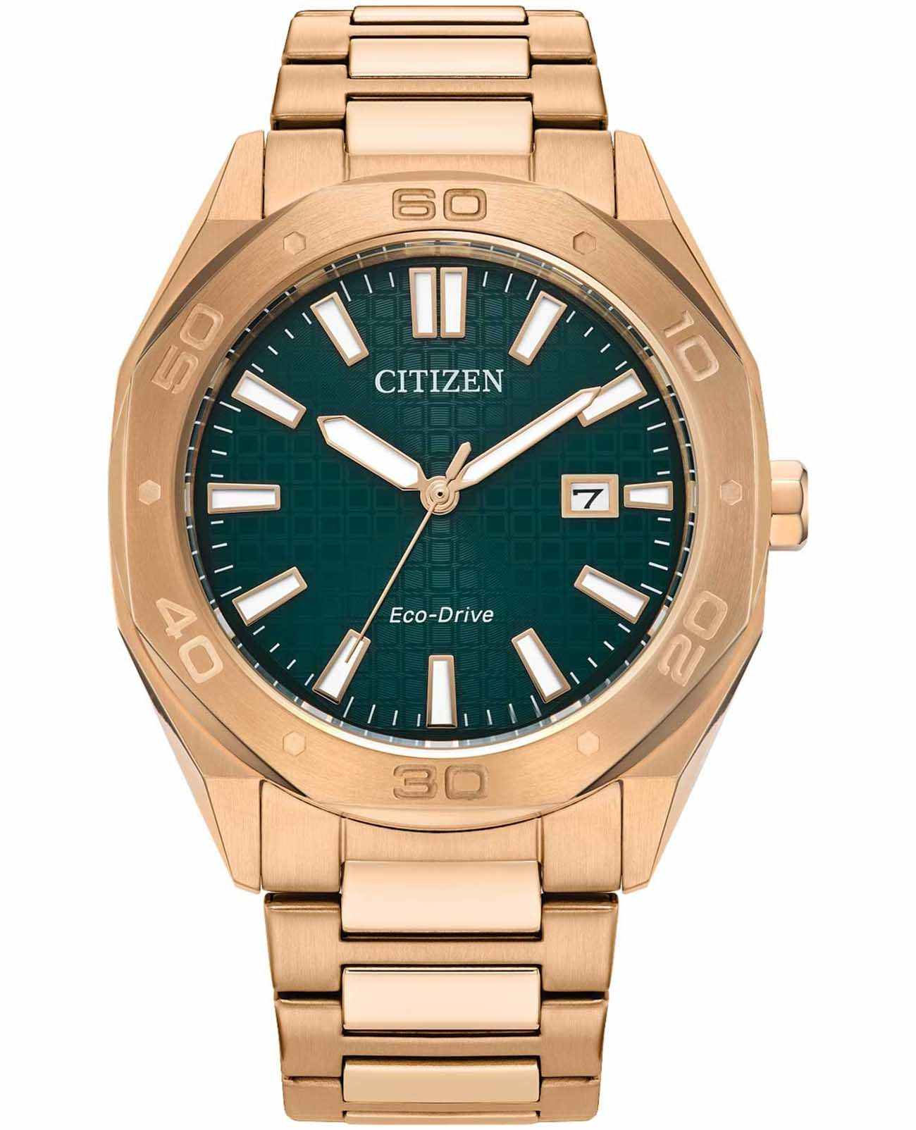 Часы Citizen BM7633-81X сочетают в себе современный стиль и высокую функциональность. Японский кварцевый механизм калибра Citizen E111 обеспечивает точную работу и надежность, а инновационная система Eco-Drive позволяет забыть о замене батареек — питание осуществляется за счет солнечной энергии, с запасом хода до 180 дней. Корпус и браслет выполнены из прочной нержавеющей стали с золотистым IP-покрытиемIP-покрытиеМетод ионного напыления. Демонстрирует повышенную устойчивость к истиранию, окислению и химическим веществам. Под воздействием высокого давления и температуры около 1500°C молекулы металла надёжно соединяются с частицами корпуса часов., что гарантирует долговечность и устойчивость к износу. На безелеБезельВнешний ободок, закрепляющий стекло. В спортивных часах так называется поворотное кольцо с делениями на циферблате, выполняет роль таймера – замеряет отрезки времени на шкале. Неподвижный безель – элемент декора. Однонаправленно вращающийся безель на дайверских часах позволяет фиксировать моменты погружения и выныривания на поверхность. выгравирована секундная и минутная шкала. Элегантный темно-зеленый циферблат со стрелками и метками с люминесцентным покрытиемЛюминесцентное покрытиеПозволяет считывать показания времени в темноте. Производители наносят на стрелки, часовые индексы, безель или поверхность циферблата светонакопительный состав, дающий холодное свечение. защищен устойчивым к царапинам минеральным стекломМинеральное стеклоМинеральное стекло представляет собой искусственно выращенный минерал кварца. Такое стекло отличается особой устойчивостью к повреждениям и царапинам. Уступает по некоторым качествам сапфировому стеклу. . Водозащита до 100 метров позволяет использовать часы при плавании и в повседневных ситуациях. Окно даты расположено на отметке «3 часа», а браслет оснащен удобной раскладной застёжкойРаскладная застёжкаТакой тип застёжки используется только на браслетах из металла. Она никогда не раскрывается полностью, происходит разделение на 2 и более частей. Раскладывающая застёжка снизит вероятность потери часов к минимуму.. Диаметр корпуса составляет 41 мм, толщина — 9,7 мм, ширина браслета — 22 мм, вес — 136 г. Эти часы станут отличным выбором для тех, кто ценит надежность, практичность и стильный внешний вид.