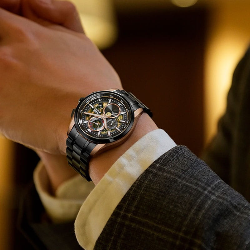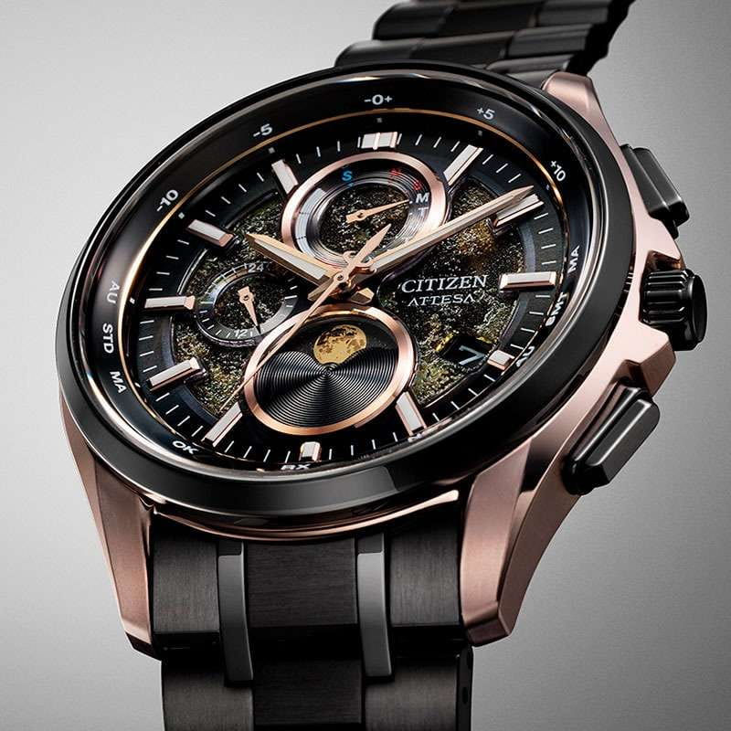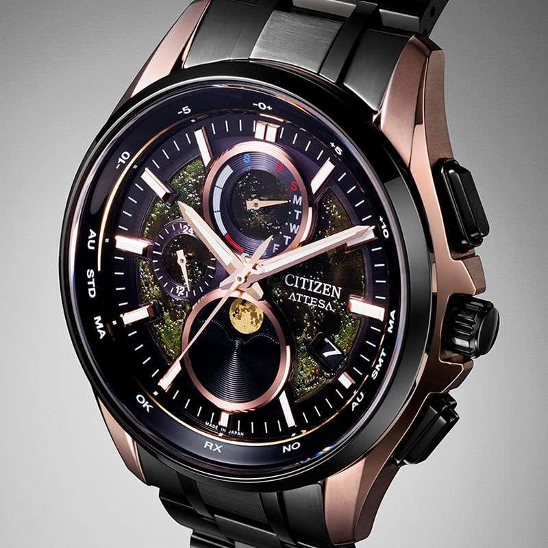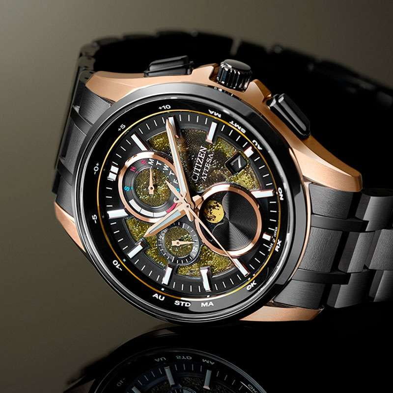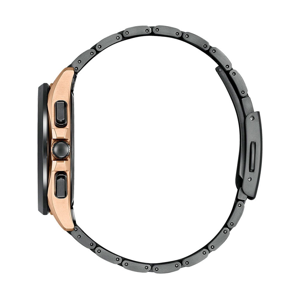 Часы Citizen BY1009-64Y — это гармоничное сочетание современного японского стиля, передовых технологий и высокого уровня надежности. Модель выполнена в прочном и легком корпусе из инновационного суперлегкого титана Super Titanium Duratect TIC с золотистым DLC-покрытиемDLC-покрытиеDiamond like carbon - одно из лучших видов покрытия, представляющее собой углерод с алмазными свойствами. На поверхность материала наносятся распавшиеся молекулы углерода, превращающиеся в плёнку из алмазоподобных связей, которая перенимает твёрдость алмаза. диаметром 41,5 мм и толщиной 10,8 мм, дополненном браслетом шириной 22 мм с удобной раскладной застёжкойРаскладная застёжкаТакой тип застёжки используется только на браслетах из металла. Она никогда не раскрывается полностью, происходит разделение на 2 и более частей. Раскладывающая застёжка снизит вероятность потери часов к минимуму.. БезельБезельВнешний ободок, закрепляющий стекло. В спортивных часах так называется поворотное кольцо с делениями на циферблате, выполняет роль таймера – замеряет отрезки времени на шкале. Неподвижный безель – элемент декора. Однонаправленно вращающийся безель на дайверских часах позволяет фиксировать моменты погружения и выныривания на поверхность. и браслет с элегантным черным DLC-покрытиемDLC-покрытиеDiamond like carbon - одно из лучших видов покрытия, представляющее собой углерод с алмазными свойствами. На поверхность материала наносятся распавшиеся молекулы углерода, превращающиеся в плёнку из алмазоподобных связей, которая перенимает твёрдость алмаза. Кварцевый механизм калибра Citizen H874 оснащен системой Eco-Drive, которая работает на солнечной энергии, не требуя замены батарейки, и обеспечивает запас хода до 180 дней. Часы отличаются высокой точностью хода — отклонение составляет всего +/- 15 секунд в месяц. Среди функциональных особенностей — автоматическая настройка времени по радиосигналу для Германии, Японии, США и Китая, вечный календарь, функция мирового времениМировое время Полезное часовое усложнение, отображающее время в основных городах и известных областях по всему миру, оно связано с часовыми поясами, удобно для путешественников и бизнесменов. , 12/24-часовой формат, автоматическое переключение летнего и зимнего времени, а также уникальный полностью автоматизированный радиоуправляемый механизм определения фаз Луны с возможностью отображения как для северного, так и южного полушария. На черном циферблате расположена апертура даты в положении 4 часа, все стрелки с люминесцентным покрытиемЛюминесцентное покрытиеПозволяет считывать показания времени в темноте. Производители наносят на стрелки, часовые индексы, безель или поверхность циферблата светонакопительный состав, дающий холодное свечение. для отличной читаемости в любое время суток. Устойчивое к царапинам сапфировое стеклоСапфировое стеклоПрочный и надёжный материал из кристалла сапфира синтетического происхождения, характеризующийся особой твёрдостью и устойчивостью к царапинам и повреждениям. с антибликовым покрытиемАнтибликовое покрытиеСлой оксида металла в 0,13-0,3 микрон, благодаря которому стекло часов не бликует и не отражает свет. Антибликовое покрытие уменьшает отражение света в 10 раз, обеспечивая отличную читаемость показателей циферблата. надежно защищает циферблат. Водозащита уровня WR 100 позволяет