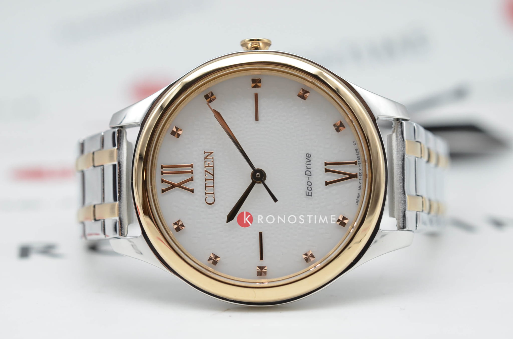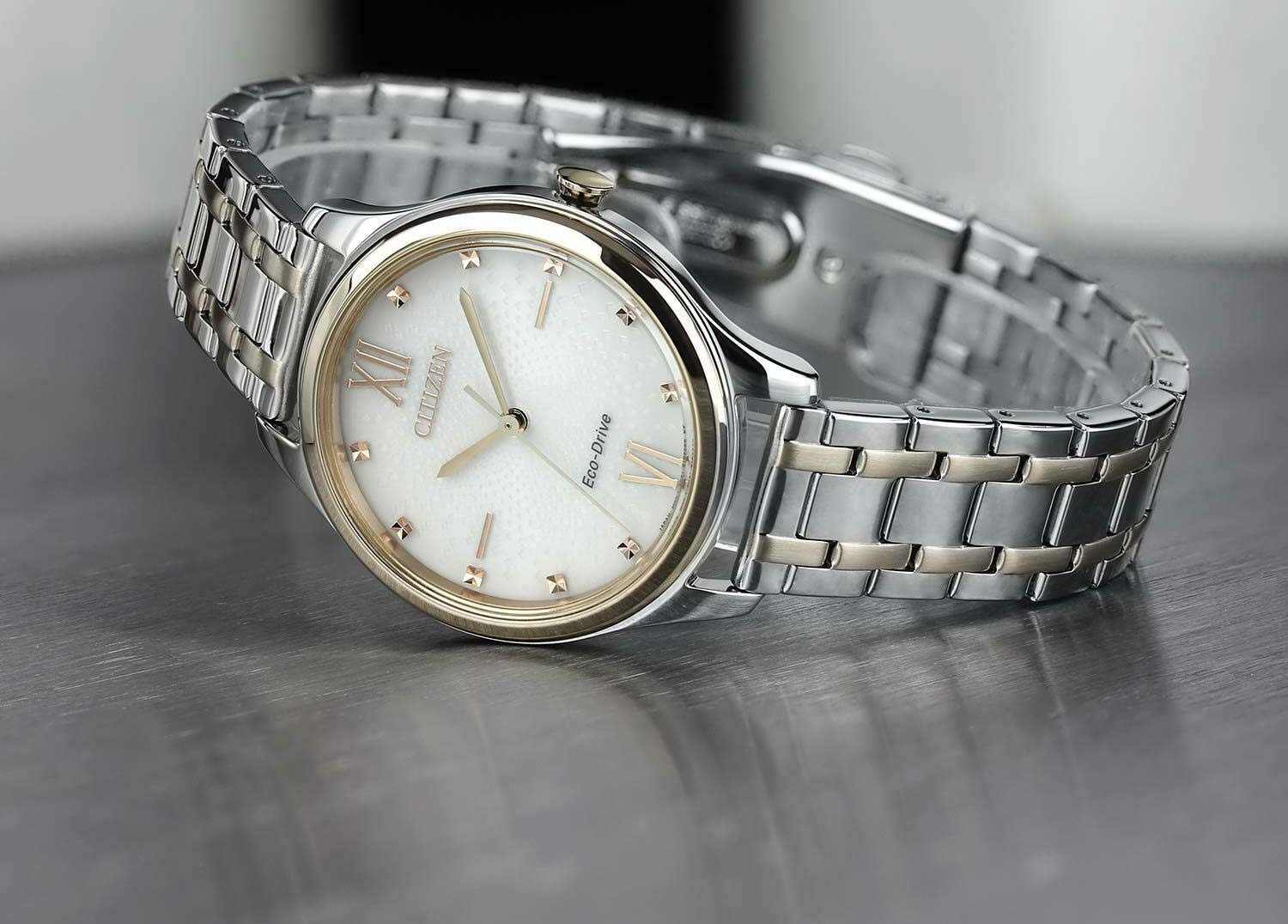 Часы Citizen EM0506-77A— это стильная модель, сочетающая в себе утонченную классику и современные технологии. Корпус изготовлен из прочной нержавеющей стали, а безельБезельВнешний ободок, закрепляющий стекло. В спортивных часах так называется поворотное кольцо с делениями на циферблате, выполняет роль таймера – замеряет отрезки времени на шкале. Неподвижный безель – элемент декора. Однонаправленно вращающийся безель на дайверских часах позволяет фиксировать моменты погружения и выныривания на поверхность. и браслет (частично) с золотистым IP-покрытиемIP-покрытиеМетод ионного напыления. Демонстрирует повышенную устойчивость к истиранию, окислению и химическим веществам. Под воздействием высокого давления и температуры около 1500°C молекулы металла надёжно соединяются с частицами корпуса часов., что обеспечивает не только износостойкость, но и элегантный внешний вид. Белый циферблат отличается кристаллами и лаконичным оформлением и защищён надёжным минеральным стекломМинеральное стеклоМинеральное стекло представляет собой искусственно выращенный минерал кварца. Такое стекло отличается особой устойчивостью к повреждениям и царапинам. Уступает по некоторым качествам сапфировому стеклу., устойчивым к царапинам. Часы оснащены инновационной системой Eco-Drive, которая позволяет заряжаться от любого источника света и не требует замены батарейки, а запас энергии составляет до 180 дней. Механизм Citizen E031 гарантирует точность хода, а функция индикации заряда EOLEOLПредставляет собой систему, уведомляющую владельца часов о необходимости замены элемента питания. За 2 недели до полного разряда батарейки секундная стрелка перестаёт ходить чётко и начинает перепрыгивать на 3-4 деления. своевременно подскажет о необходимости подзарядки. Водозащита до 50 метров обеспечивает дополнительную практичность и защищает механизм от влаги при повседневном использовании. Браслет шириной 14 мм и длиной 143 мм удобно фиксируется на запястье с помощью раскладной застёжкиРаскладная застёжкаТакой тип застёжки используется только на браслетах из металла. Она никогда не раскрывается полностью, происходит разделение на 2 и более частей. Раскладывающая застёжка снизит вероятность потери часов к минимуму. с системой блокировки, что обеспечивает надёжность и комфорт в течение всего дня. Диаметр корпуса составляет 32 мм, а толщина — 7,6 мм, благодаря чему часы выглядят изящно и подходят для любого случая. Citizen