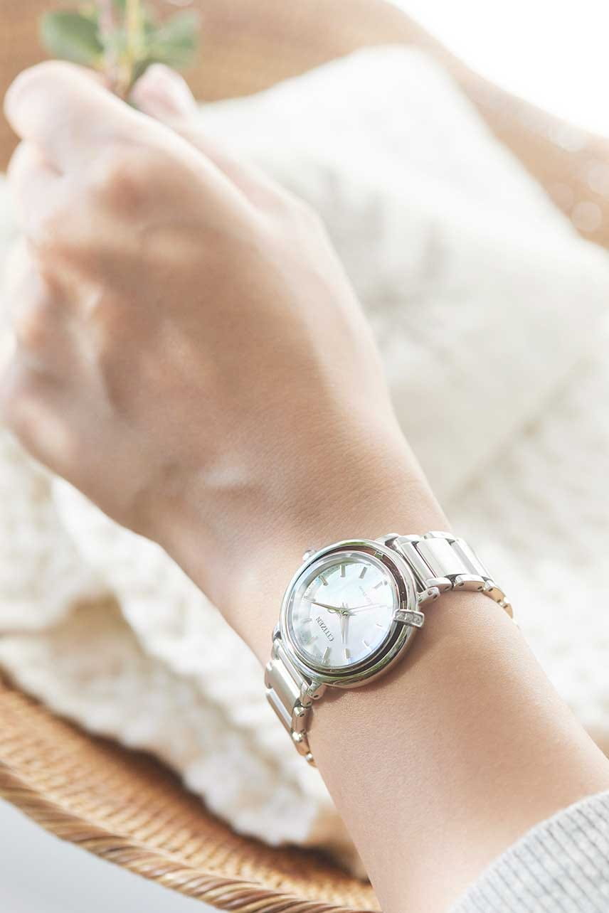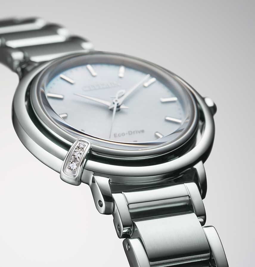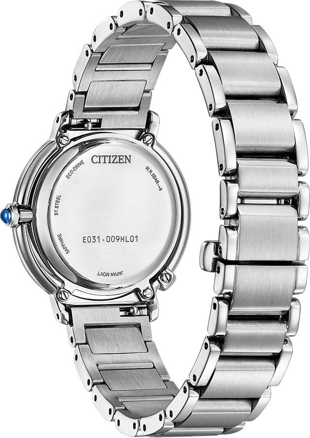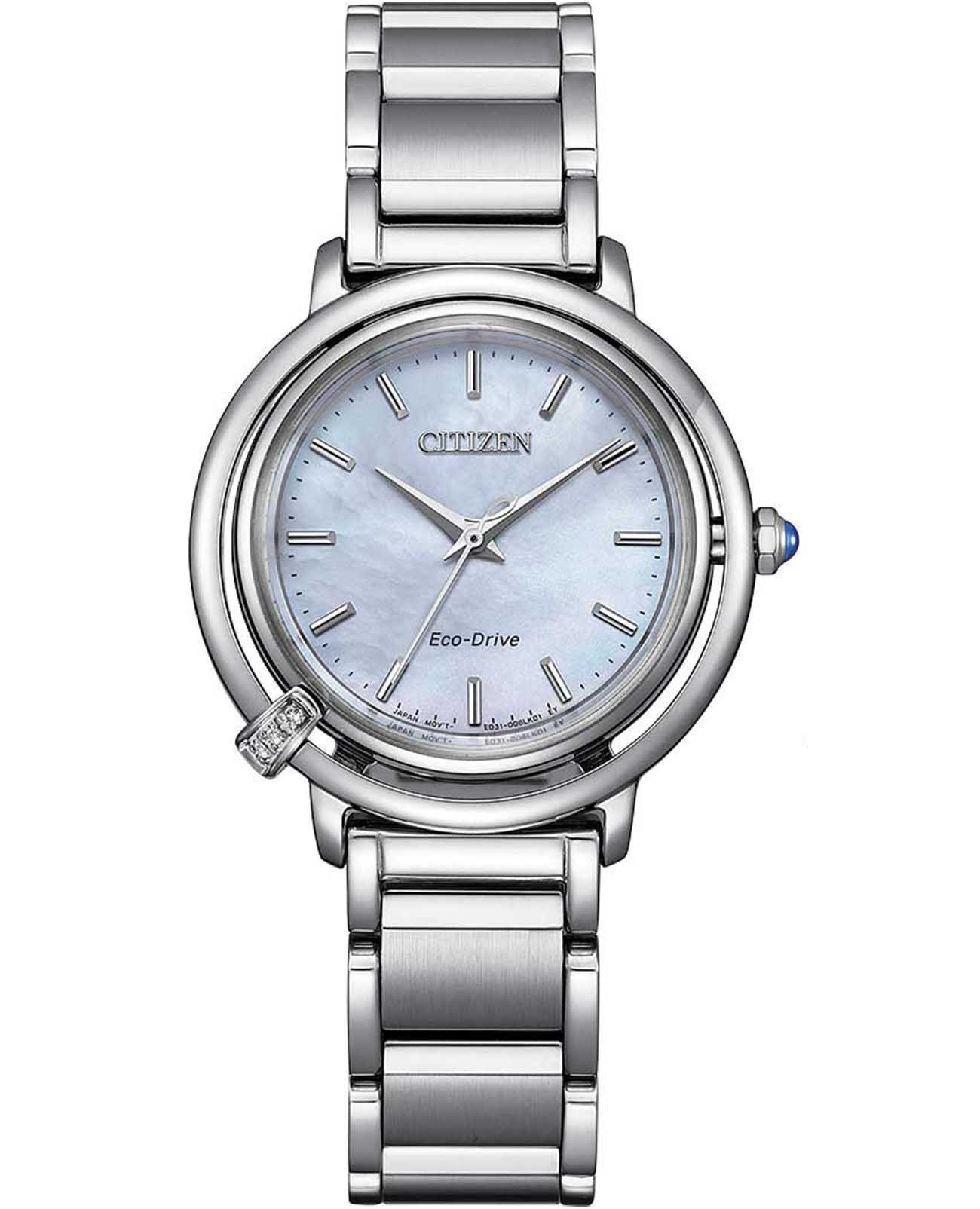Часы Citizen EM1090-60D – это элегантная модель, созданная в Японии и сочетающая в себе современные технологии и изысканный дизайн. Надежный кварцевый механизм Citizen E031 с инновационной системой Eco-Drive работает от солнечной энергии и не требует замены батарейки, обеспечивая запас хода до 180 дней. Корпус часов выполнен из нержавеющей стали и украшен тремя кристаллами, что придает аксессуару особое сияние. Перламутровый голубой циферблат с лаконичными метками защищен выпуклым сапфировым стекломСапфировое стеклоПрочный и надёжный материал из кристалла сапфира синтетического происхождения, характеризующийся особой твёрдостью и устойчивостью к царапинам и повреждениям., устойчивым к царапинам. Заводная головка декорирована камнем в форме кабошона, а задняя крышка закреплена на четырех винтах. Стальной браслет оснащен застежкой «бабочка»Застёжка "бабочка"Такой вид застёжки дополняется предохранителями, помогающими избежать случайного раскрытия браслета. Обладают изящным исполнением. и системой быстрой замены, что позволяет легко менять стиль часов в зависимости от вашего настроения. В комплекте также идет сменный черный ремешок с такой же застежкой. Водозащита 50WR позволяет не беспокоиться о случайном контакте с водой. Компактные размеры корпуса (диаметр 31,2 мм, толщина 7,8 мм, вес 71 г) обеспечивают комфортное ношение каждый день. Эти часы станут великолепным дополнением к любому образу и подчеркнут вашу индивидуальность.
