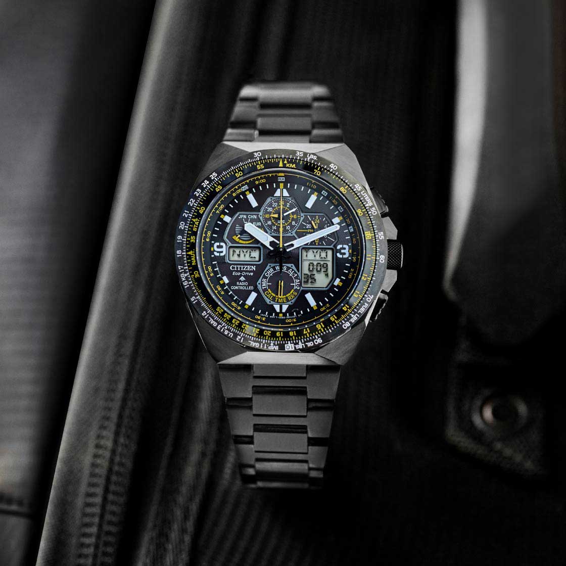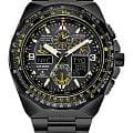 Citizen Promaster JY8127-59E часы-хронографХронографФункция позволяет измерять отрезки времени с особой точностью: часы, минуты, секунды. Верным признаком хронографа является наличие на циферблате 3 дополнительных окошек-счётчиков. с секундомеромСекундомерСекундоме́р — прибор, способный измерять интервалы времени с точностью до долей секунды. спортивного дизайна с высоким уровнем водозащиты. Корпус из нержавеющей стали с IP-покрытиемIP-покрытиеМетод ионного напыления. Демонстрирует повышенную устойчивость к истиранию, окислению и химическим веществам. Под воздействием высокого давления и температуры около 1500°C молекулы металла надёжно соединяются с частицами корпуса часов. диаметром 45,7 мм идеально сбалансирован. Сапфировое стеклоСапфировое стеклоПрочный и надёжный материал из кристалла сапфира синтетического происхождения, характеризующийся особой твёрдостью и устойчивостью к царапинам и повреждениям. с антибликовым покрытием обеспечивает отличную защиту циферблата от царапин. Часы работают на основе кварцевого механизма, питание от солнечной энергии. Стальной браслет на раскладной застёжкеРаскладная застёжкаТакой тип застёжки используется только на браслетах из металла. Она никогда не раскрывается полностью, происходит разделение на 2 и более частей. Раскладывающая застёжка снизит вероятность потери часов к минимуму. идеально дополняют дизайн часов, обеспечивая комфортное ношение. Стрелки и метки на циферблате имеют люминесцентное покрытиеЛюминесцентное покрытиеПозволяет считывать показания времени в темноте. Производители наносят на стрелки, часовые индексы, безель или поверхность циферблата светонакопительный состав, дающий холодное свечение. позволяющее легко определять время даже в темноте. Поворотный безельБезельВнешний ободок, закрепляющий стекло. В спортивных часах так называется поворотное кольцо с делениями на циферблате, выполняет роль таймера – замеряет отрезки времени на шкале. Неподвижный безель – элемент декора. Однонаправленно вращающийся безель на дайверских часах позволяет фиксировать моменты погружения и выныривания на поверхность.. Автоматический прием сигналов от радиовышек, расположенных в различных точках земного шара, которые передают временные сигналы от определенных атомных часов. Коррекция текущего времени радиосигналом на территории почти всей Европы, США, Японии и Китая. Функция индикации заряда (EOL) и предотвращения перезарядки. Мировое времяМировое время Полезное часовое усложнение, отображающее время в основных городах и известных областях по всему миру, оно связано с часовыми поясами, удобно для путешественников и бизнесменов. - 43 города, переход на зимнее и летнее время. Всемирное координированное время UTCUTCВсемирное кординационное время, не имеющее привязки к географическому положению Гринвича, основывается на атомном отсчёте времени. Регулировка времени осуществляется более точно, чем устаревшее GMT.