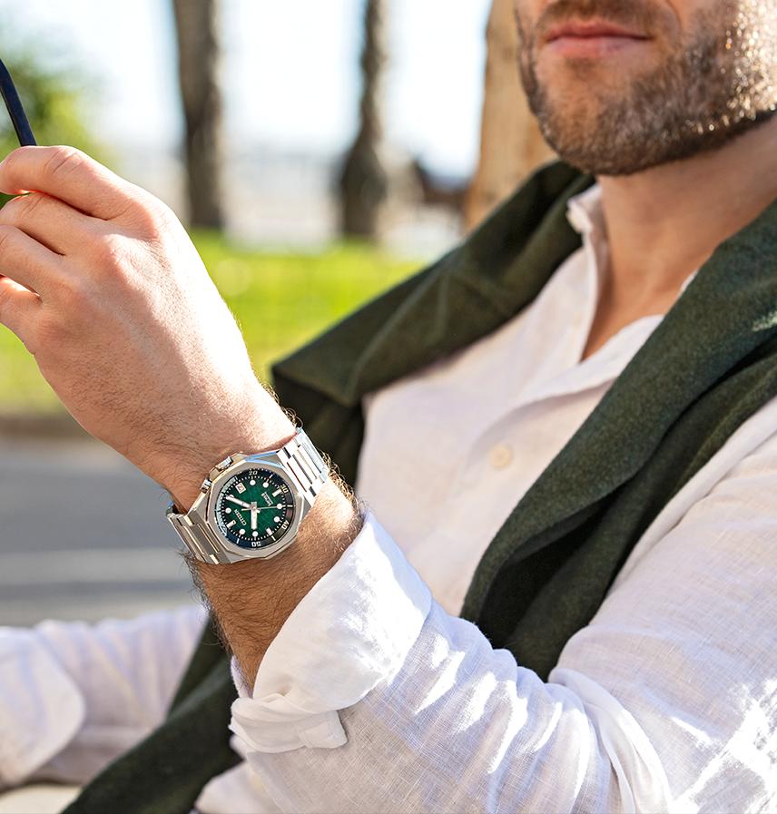 Citizen SERIES 8 NB6060-58X мужские часы спортивного дизайна с высоким уровнем водозащиты. Корпус из нержавеющей стали диаметром 42.6 мм идеально сбалансирован. Сапфировое стеклоСапфировое стеклоПрочный и надёжный материал из кристалла сапфира синтетического происхождения, характеризующийся особой твёрдостью и устойчивостью к царапинам и повреждениям. с антибликовым покрытием обеспечивает отличную защиту циферблата от царапин. Механические часы с автоподзаводом. Стальной браслет на раскладной застёжкеРаскладная застёжкаТакой тип застёжки используется только на браслетах из металла. Она никогда не раскрывается полностью, происходит разделение на 2 и более частей. Раскладывающая застёжка снизит вероятность потери часов к минимуму. идеально дополняют дизайн часов, обеспечивая комфортное ношение. Стрелки и метки на циферблате имеют люминесцентное покрытиеЛюминесцентное покрытиеПозволяет считывать показания времени в темноте. Производители наносят на стрелки, часовые индексы, безель или поверхность циферблата светонакопительный состав, дающий холодное свечение. позволяющее легко определять время даже в темноте. Окошко даты находится в положении 3 часа. Магнитоустойчивость 16000 а/м. Запас хода около 42 часов. Циферблат тёмно-зелёного цвета с текстурой, вдохновлённой ночным небом Токио, наложенной на традиционный японский узор «чекерборд», символизирующий процветание. Часы обладают впечатляющей водонепроницаемостью до 200WR, что делает их идеальными для плавания. Прозрачная задняя крышка.