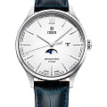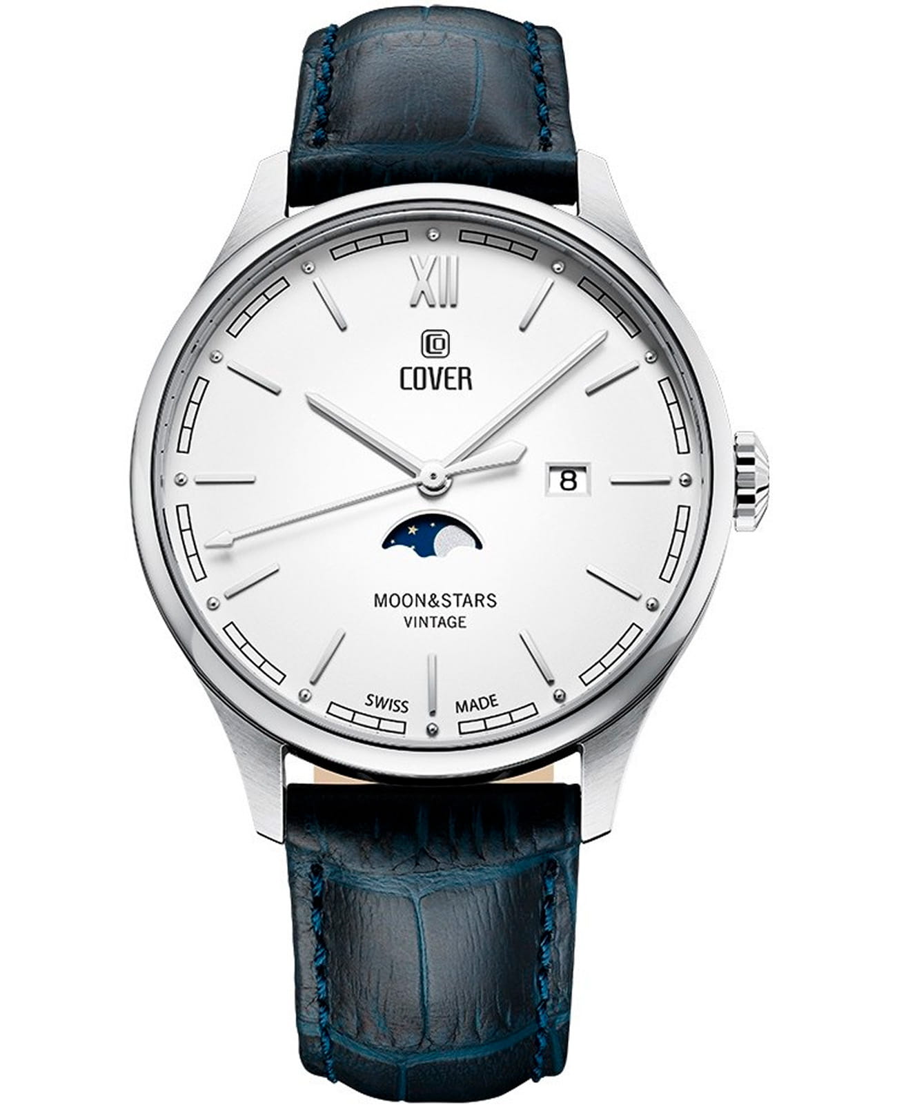 Мужские наручные часы Cover CO202.01 из коллекции Chapman Moon&Stars сочетают в себе классический дизайн и высокую точность швейцарского производства. Модель обладает круглым корпусом диаметром 41 мм, изготовленным из нержавеющей стали. Браслет выполнен из синей кожи, оснащён классической застёжкой для комфортного ношения. Белый циферблат украшен индексами-маркеры и оснащен индикатором фаз Луны, а также окном даты на «3 часах». Для защиты используется минеральное стеклоМинеральное стеклоМинеральное стекло представляет собой искусственно выращенный минерал кварца. Такое стекло отличается особой устойчивостью к повреждениям и царапинам. Уступает по некоторым качествам сапфировому стеклу. с антибликовым покрытиемАнтибликовое покрытиеСлой оксида металла в 0,13-0,3 микрон, благодаря которому стекло часов не бликует и не отражает свет. Антибликовое покрытие уменьшает отражение света в 10 раз, обеспечивая отличную читаемость показателей циферблата., обеспечивающее прочную защиту от царапин и превосходную читаемость времени. Часы работают на кварцевом механизме, гарантирующем исключительную точность хода с погрешностью около 20 секунд в месяц. Водонепроницаемость достигает 5 атмосфер (50 метров), что позволяет использовать их в повседневной жизни, однако не рекомендуется для плавания или дайвинга. Эти швейцарские часы станут идеальным дополнением как классического, так и современного образа мужчины, ценящего качество и стиль.