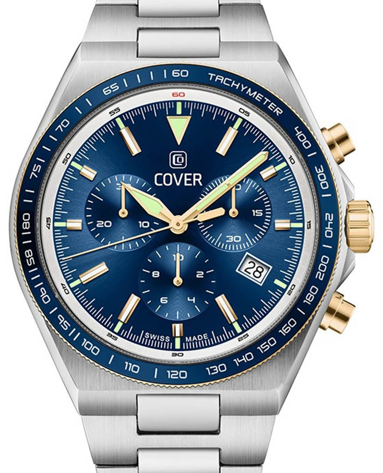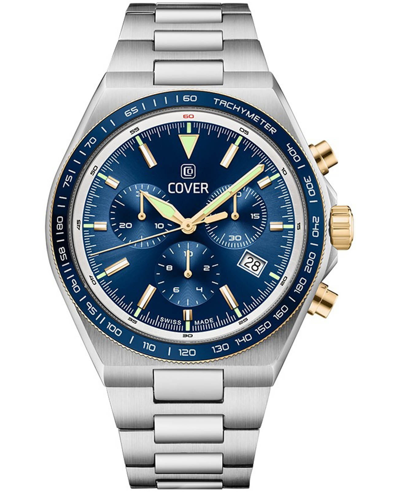 Мужские наручные часы-хронографХронографФункция позволяет измерять отрезки времени с особой точностью: часы, минуты, секунды. Верным признаком хронографа является наличие на циферблате 3 дополнительных окошек-счётчиков. Cover CO212.04 из коллекции Iconosteel сочетают в себе классический дизайн и надежность современных технологий. Модель обладает круглым корпусом диаметром 41 мм, изготовленным из нержавеющей стали с частичным PVD-покрытиемPVDУльтратонкое покрытие наносится в технике вакуумного напыления, сочетает в себе нитрид титана особой прочности со слоем золота или оксида хрома. Несёт в себе декоративную или защитную функцию., что обеспечивает высокую устойчивость к внешним воздействиям. Браслет выполнен из нержавеющей стали с раскладной застёжкойРаскладная застёжкаТакой тип застёжки используется только на браслетах из металла. Она никогда не раскрывается полностью, происходит разделение на 2 и более частей. Раскладывающая застёжка снизит вероятность потери часов к минимуму., гарантирующей комфортное ношение и безопасность. Синий циферблат оснащен  окном даты на «4 часах» и стрелками с люминесцентным покрытиемЛюминесцентное покрытиеПозволяет считывать показания времени в темноте. Производители наносят на стрелки, часовые индексы, безель или поверхность циферблата светонакопительный состав, дающий холодное свечение.. Для защиты используется сапфировое стеклоСапфировое стеклоПрочный и надёжный материал из кристалла сапфира синтетического происхождения, характеризующийся особой твёрдостью и устойчивостью к царапинам и повреждениям., обеспечивающее прочную защиту от царапин и антибликовый эффект. Часы работают на кварцевом механизме, что гарантирует точное время без необходимости подзаводки. Модель также является хронографом, оснащенным функцией секундомераСекундомерСекундоме́р — прибор, способный измерять интервалы времени с точностью до долей секунды., делая ее идеальной для активного образа жизни. Водонепроницаемость часов достигает 10 атмосфер (100 метров), что позволяет использовать их во время плавания и других водных видов спорта, однако не рекомендуется для глубоководного дайвинга.