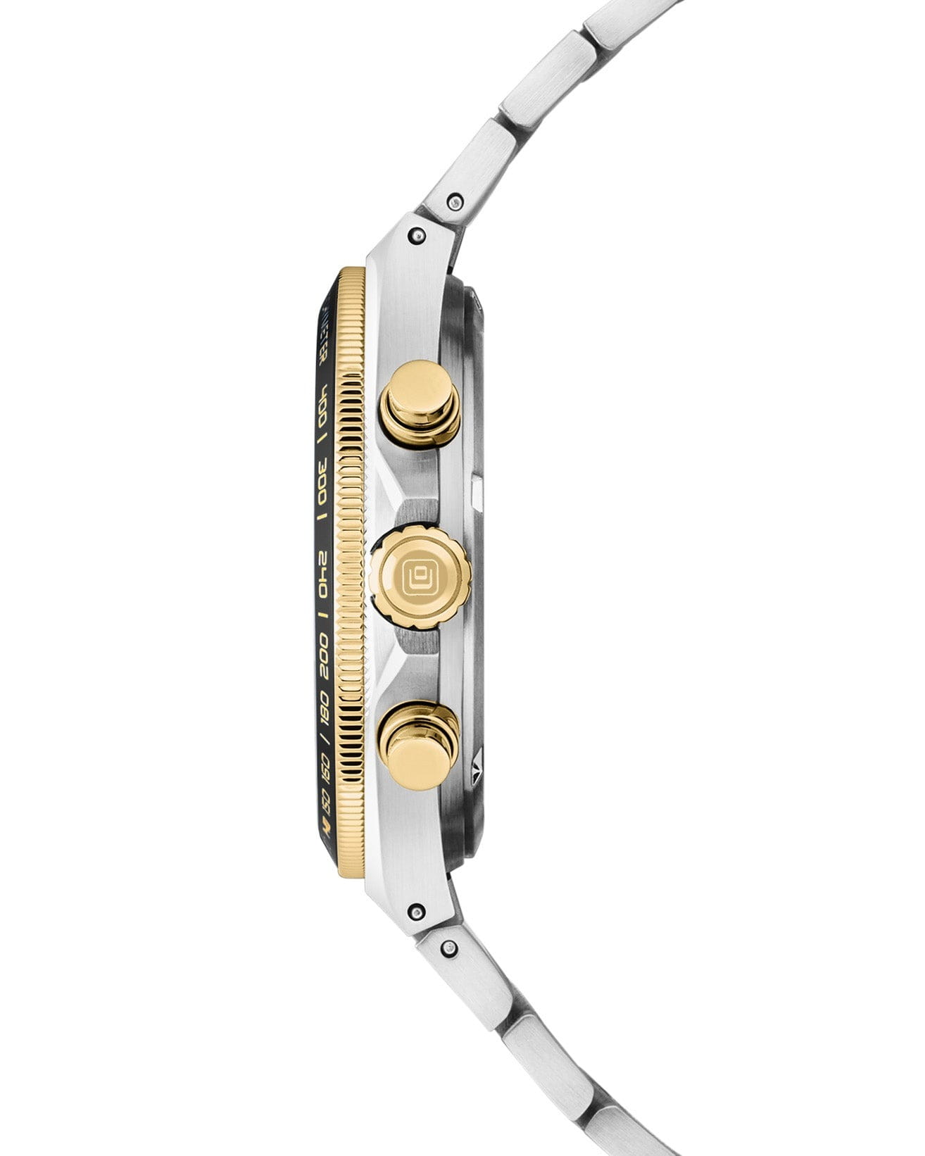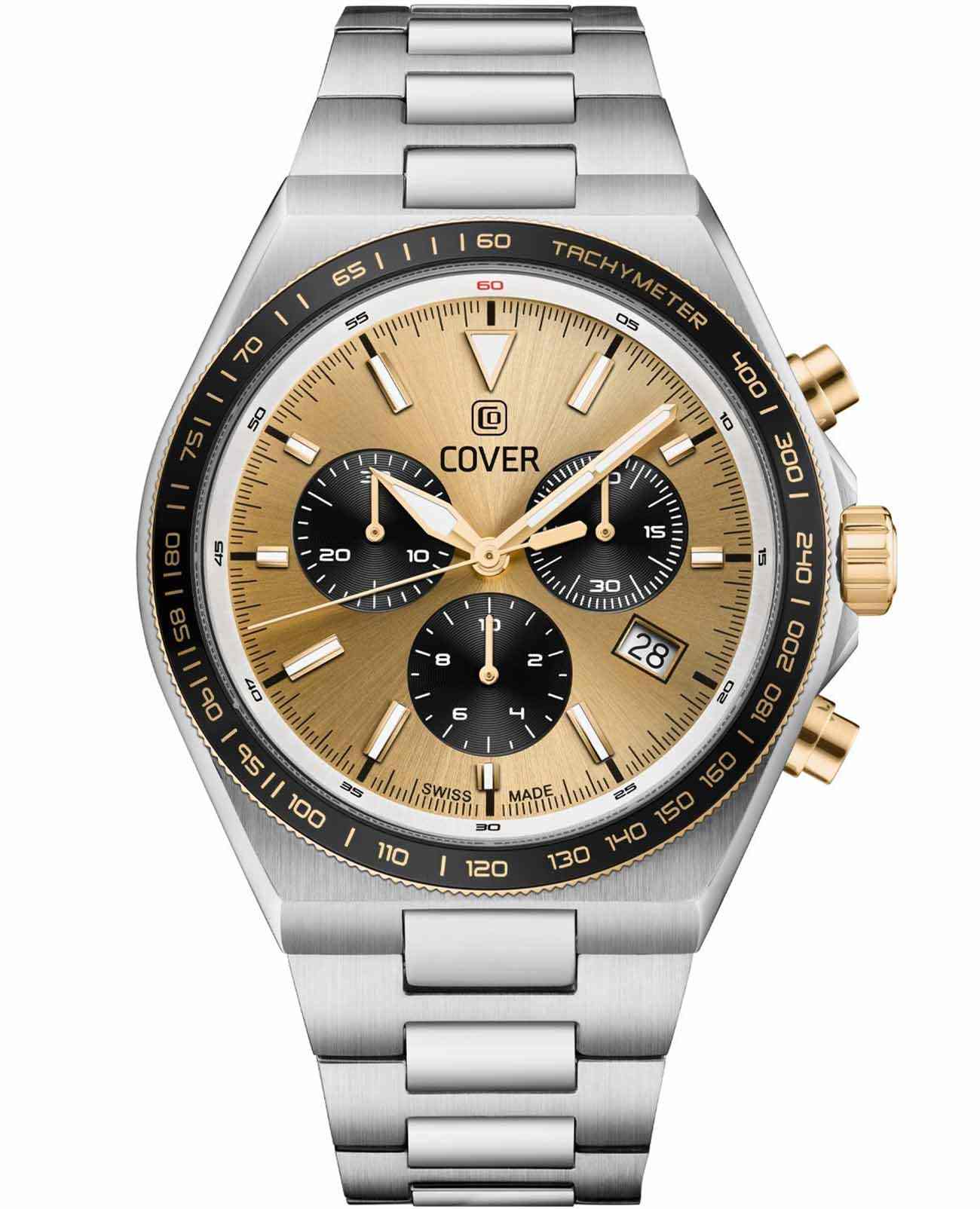Мужские наручные часы-хронографХронографФункция позволяет измерять отрезки времени с особой точностью: часы, минуты, секунды. Верным признаком хронографа является наличие на циферблате 3 дополнительных окошек-счётчиков. Cover CO212.08 из коллекции Iconosteel сочетают в себе классический дизайн и надежность современных технологий. Часы оснащены кварцевым механизмом с модулем хронографа Ronda 5040.D, они обеспечивают точность и надежность в каждом моменте. Модель обладает круглым корпусом диаметром 41 мм, изготовленным из нержавеющей стали, что обеспечивает высокую устойчивость к внешним воздействиям. Браслет выполнен из нержавеющей стали с раскладной застёжкойРаскладная застёжкаТакой тип застёжки используется только на браслетах из металла. Она никогда не раскрывается полностью, происходит разделение на 2 и более частей. Раскладывающая застёжка снизит вероятность потери часов к минимуму., гарантирующей комфортное ношение и безопасность. Золотистый циферблат оснащен окном даты на «4 часах» и стрелками с люминесцентным покрытиемЛюминесцентное покрытиеПозволяет считывать показания времени в темноте. Производители наносят на стрелки, часовые индексы, безель или поверхность циферблата светонакопительный состав, дающий холодное свечение.. Для защиты используется сапфировое стеклоСапфировое стеклоПрочный и надёжный материал из кристалла сапфира синтетического происхождения, характеризующийся особой твёрдостью и устойчивостью к царапинам и повреждениям., обеспечивающее прочную защиту от царапин и антибликовый эффект. На черный безельБезельВнешний ободок, закрепляющий стекло. В спортивных часах так называется поворотное кольцо с делениями на циферблате, выполняет роль таймера – замеряет отрезки времени на шкале. Неподвижный безель – элемент декора. Однонаправленно вращающийся безель на дайверских часах позволяет фиксировать моменты погружения и выныривания на поверхность. с PVD-покрытиемPVDУльтратонкое покрытие наносится в технике вакуумного напыления, сочетает в себе нитрид титана особой прочности со слоем золота или оксида хрома. Несёт в себе декоративную или защитную функцию. нанесена шкала тахиметраТахиметрРазмеченная шкала, располагается на ободке или безеле часов. Тахиметр позволяет рассчитать скорость на определённом участке пути, расстояние измеряется в километрах или милях.. Модель также является хронографом, оснащенным функцией секундомераСекундомерСекундоме́р — прибор, способный измерять интервалы времени с точностью до долей секунды., делая ее идеальной для активного образа жизни. Водонепроницаемость часов достигает 10 атмосфер (100 метров), что позволяет использовать их во время плавания и других водных видов спорта, однако не рекомендуется для глубоководного дайвинга.