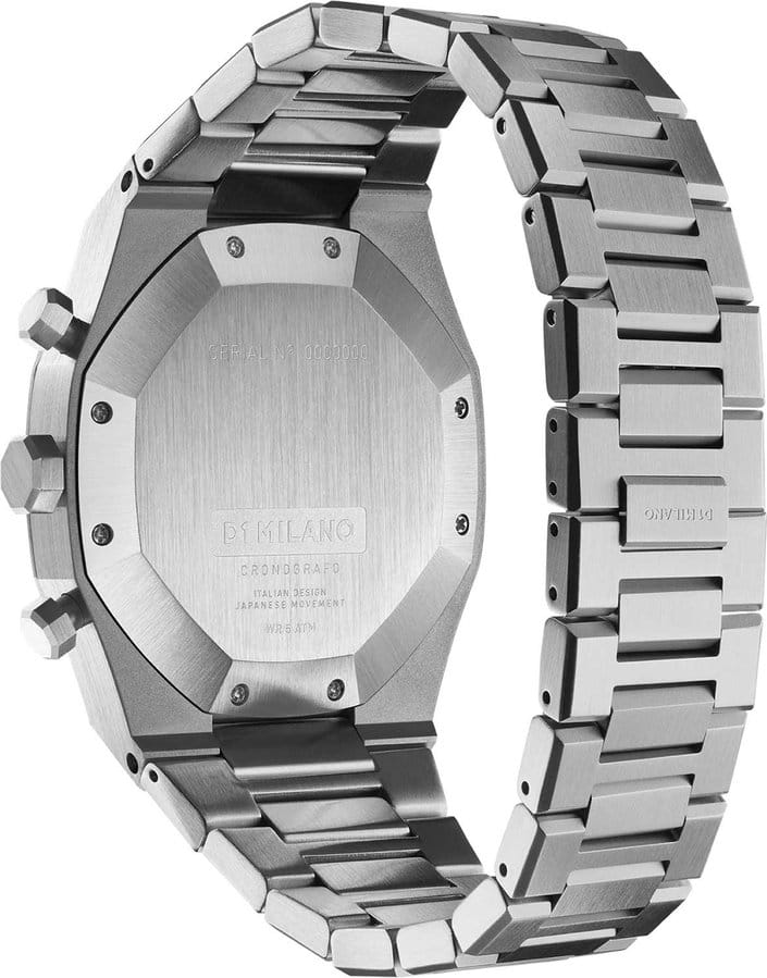 Элегантный хронограф D1 Milano Cronografo CHBJ08 New Black - идеальное воплощение мужественности и стиля. Этот многофункциональный аксессуар оснащен секундомером,тахиметромТахиметрРазмеченная шкала, располагается на ободке или безеле часов. Тахиметр позволяет рассчитать скорость на определённом участке пути, расстояние измеряется в километрах или милях. и двойным форматом времени, что делает его незаменимым компаньоном в повседневной жизни. Минималистичный дизайн циферблата с штриховыми метками, защищенный прочным сапфировым стекломСапфировое стеклоПрочный и надёжный материал из кристалла сапфира синтетического происхождения, характеризующийся особой твёрдостью и устойчивостью к царапинам и повреждениям., привлекает внимание своей сдержанной красотой. Надежная конструкция с задней крышкой на 8 винтах и стильный браслет с удобной застежкой обеспечивают комфорт при ношении. Каждый экземпляр уникален благодаря индивидуальному серийному номеру. New Black - это не просто часы, а статусный аксессуар, подчеркивающий безупречный вкус и внимание к деталям своего владельца.