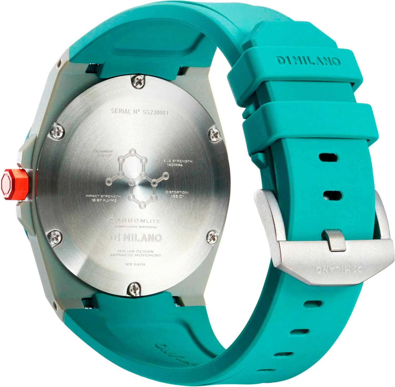 Часы D1 Milano CLRJ07 Sage Carbonlite из коллекции Carbonlite - воплощение инновационного дизайна и передовых материалов. Циферблат с метками в виде штрихов выполнен по технологии Sunray (солнечные лучи). Круглый корпус диаметром 40,5 мм и толщиной 9,7 мм изготовлен из композита углеродного нейлона с поликарбонатной рамкой. Циферблат выполнен в виде "сэндвича" из углеродного волокна. Часы оснащены кварцевым механизмом Miyota GL22, минеральное стекломМинеральное стеклоМинеральное стекло представляет собой искусственно выращенный минерал кварца. Такое стекло отличается особой устойчивостью к повреждениям и царапинам. Уступает по некоторым качествам сапфировому стеклу. с антибликовым покрытием и бирюзовым силиконовым ремешком. Водонепроницаемость 5 АТМ, вес всего 47 г. Особенность этой коллекции - использование композитных материалов из углеродного нейлона и волокна, специально разработанных D1 Milano. Нить изготовлена из EPA-CF, прочность на растяжение 140 МПа, деформация 155 градусов, ударная вязкость 18,67 кДж/м2.