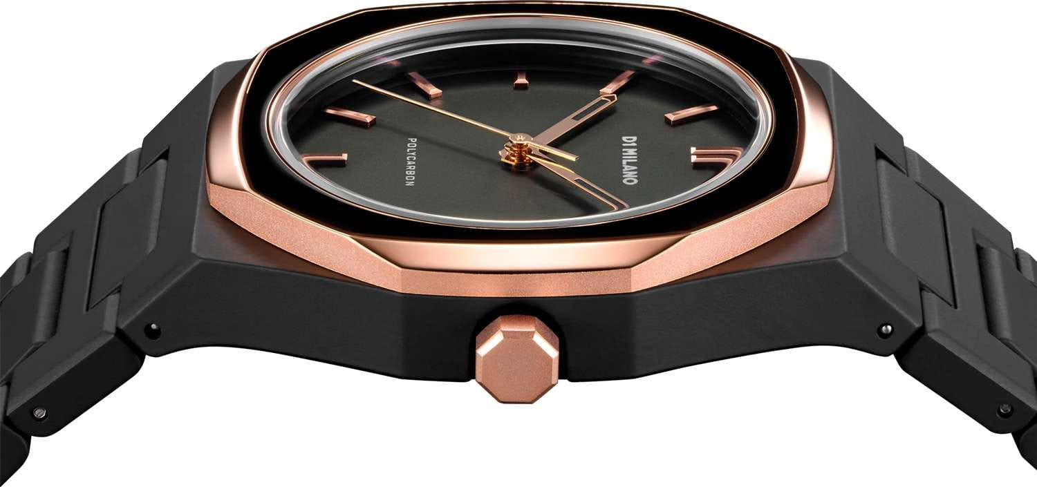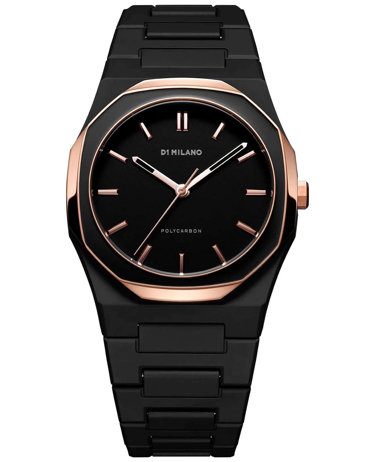 Часы D1 Milano Polycarbon PCBU14 – современные часы в стиле унисекс для повседневных образов. Модель Gold Mesh имеет черный корпус из поликарбоната с покрытием Софт-Тач и полированный стальной безельБезельВнешний ободок, закрепляющий стекло. В спортивных часах так называется поворотное кольцо с делениями на циферблате, выполняет роль таймера – замеряет отрезки времени на шкале. Неподвижный безель – элемент декора. Однонаправленно вращающийся безель на дайверских часах позволяет фиксировать моменты погружения и выныривания на поверхность. с розовым PVD-покрытиемPVDУльтратонкое покрытие наносится в технике вакуумного напыления, сочетает в себе нитрид титана особой прочности со слоем золота или оксида хрома. Несёт в себе декоративную или защитную функцию. и черной эмалью. Циферблат лаконичный с индексами в виде штрихов, защищен минеральным стекломМинеральное стеклоМинеральное стекло представляет собой искусственно выращенный минерал кварца. Такое стекло отличается особой устойчивостью к повреждениям и царапинам. Уступает по некоторым качествам сапфировому стеклу. с антибликовым покрытием. Стальная задняя крышка на 4 винтах. Пластиковый браслет из поликарбоната с покрытием Софт-Тач на застёжке-бабочке с кнопкамиЗастёжка "бабочка"Такой вид застёжки дополняется предохранителями, помогающими избежать случайного раскрытия браслета. Обладают изящным исполнением. . Для тех, кто умеет ценить индивидуальность.