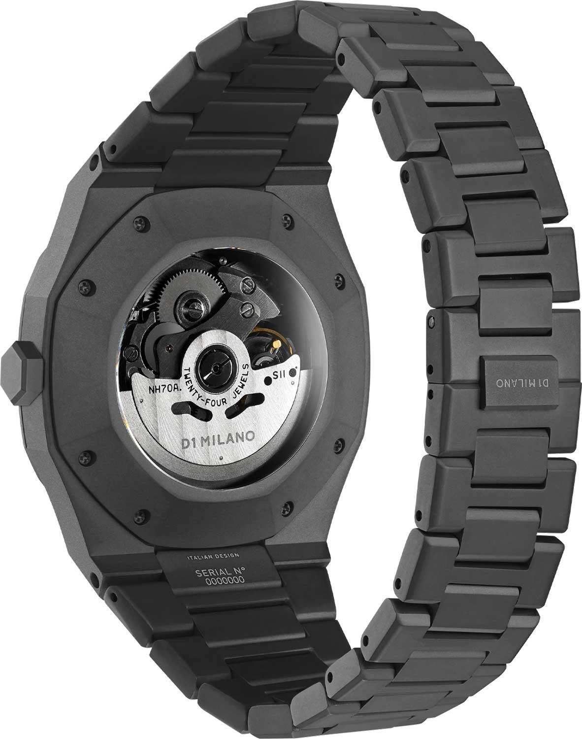 Часы D1 Milano SKBJ07 — это эффектные механические мужские часы, разработанные для ценителей уникальных аксессуаров. Их утонченный дизайн и высокое качество исполнения делают эти часы незаменимым элементом вашего стиля. Изготовленные в Италии, они оснащены надежным механизмом Seiko SII TMI NH70 с автоподзаводом, обеспечивающими запас хода до 41 часа. Частота работы механизма составляет 21600 полуколебаний в час. Часы имеют корпус из нержавеющей стали 316L с PVDPVDУльтратонкое покрытие наносится в технике вакуумного напыления, сочетает в себе нитрид титана особой прочности со слоем золота или оксида хрома. Несёт в себе декоративную или защитную функцию. покрытием, что гарантирует долговечность и стойкость к внешним воздействиям. Черный скелетонизированный циферблат защищен сапфировым стекломСапфировое стеклоПрочный и надёжный материал из кристалла сапфира синтетического происхождения, характеризующийся особой твёрдостью и устойчивостью к царапинам и повреждениям. с антибликовым покрытием, подчеркивающим элегантность и изысканность модели. Метки в виде штрихов и прозрачная задняя крышка, закрепленная на 8 винтах, придают часам особый шарм. Стальной браслет с PVDPVDУльтратонкое покрытие наносится в технике вакуумного напыления, сочетает в себе нитрид титана особой прочности со слоем золота или оксида хрома. Несёт в себе декоративную или защитную функцию. покрытием и раскладной застёжкойРаскладная застёжкаТакой тип застёжки используется только на браслетах из металла. Она никогда не раскрывается полностью, происходит разделение на 2 и более частей. Раскладывающая застёжка снизит вероятность потери часов к минимуму. обеспечивает комфортное и надежное ношение. Водозащита до 50 метров делает эти часы подходящими для повседневного использования.