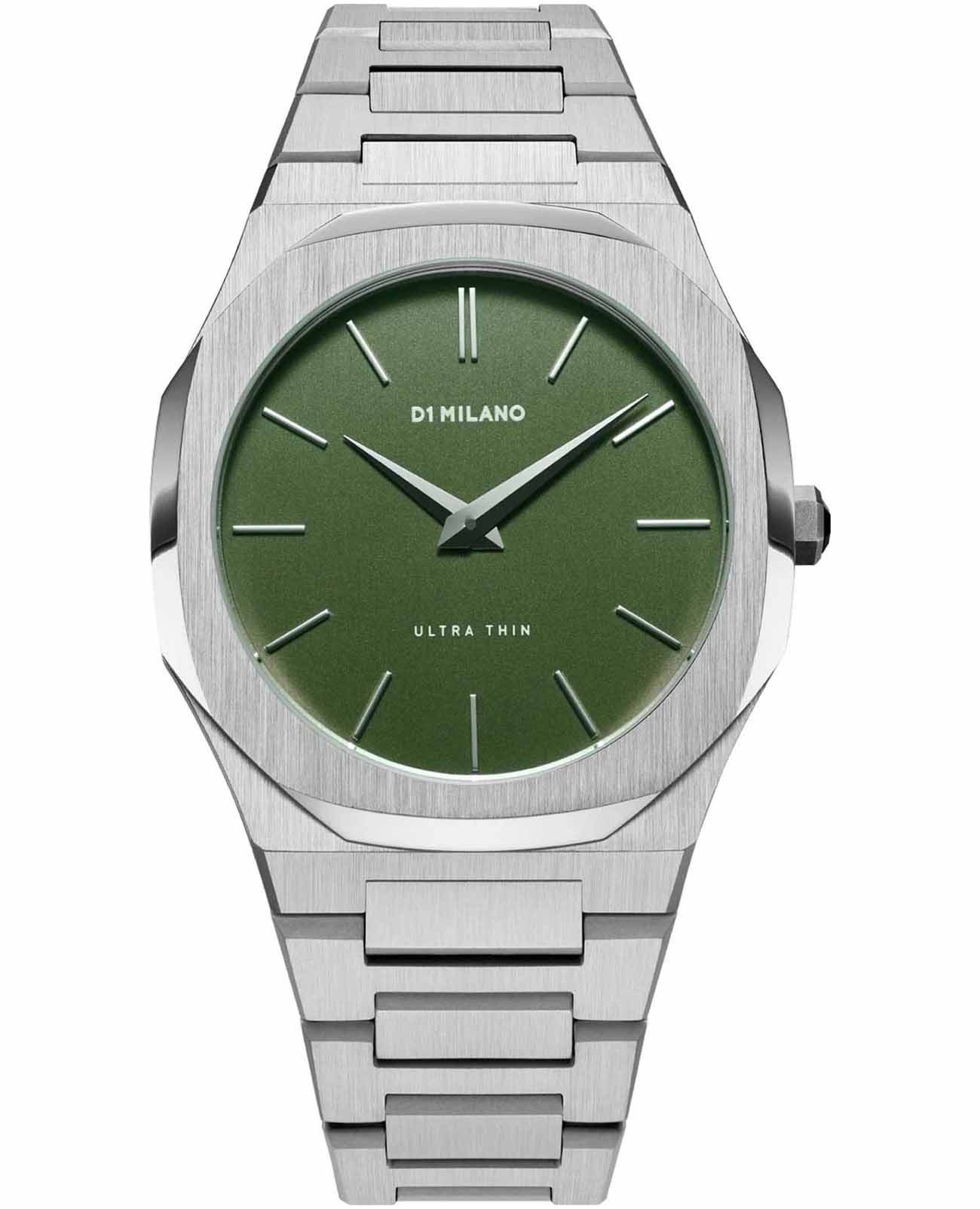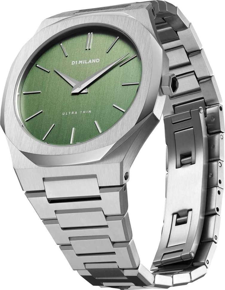 Часы D1 Milano UTBJ06 — это уникальные кварцевые часы, которые подчеркнут ваш изысканный стиль. Эти наручные часы из коллекции Ultra Thin с эффектным монохромным дизайном станут выразительным акцентом вашего образа. Корпус диаметром 40 мм из нержавеющей стали придает часам современный и утонченный вид. Зеленый циферблат метками в виде штрихов, а серебристые хроматические стрелки и индексы создают стильный контраст, подчёркивая элегантность модели. Задняя крышка из нержавеющей стали закреплена на 8-х винтах и дополнена индивидуальным серийным номером, что подчеркивает уникальность каждого экземпляра. Стальной браслет с раскладной застёжкойРаскладная застёжкаТакой тип застёжки используется только на браслетах из металла. Она никогда не раскрывается полностью, происходит разделение на 2 и более частей. Раскладывающая застёжка снизит вероятность потери часов к минимуму. обеспечивает надежность и комфорт в повседневном использовании. Сапфировое стеклоСапфировое стеклоПрочный и надёжный материал из кристалла сапфира синтетического происхождения, характеризующийся особой твёрдостью и устойчивостью к царапинам и повреждениям. с антибликовым покрытием защищает циферблат, а водозащита до 50WR делает эти часы практичным выбором для любых условий. Благодаря калибру Miyota 1L22, они отличаются точностью и надежностью. Эти итальянские часы представляют собой идеальное сочетание традиционного мастерства и инновационного подхода, воплощая в себе новый взгляд на классическую элегантность.