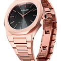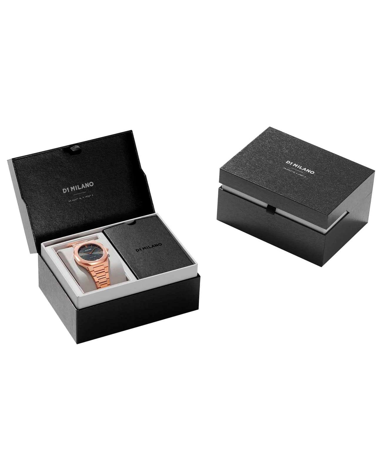 Женские наручные часы D1 Milano UTBL06 из коллекции Ultra Thin сочетают в себе элегантный дизайн и современные технологии. Модель обладает круглым корпусом диаметром 34 мм, изготовленным из нержавеющей стали с PVD-покрытиемPVDУльтратонкое покрытие наносится в технике вакуумного напыления, сочетает в себе нитрид титана особой прочности со слоем золота или оксида хрома. Несёт в себе декоративную или защитную функцию. в розовом золоте, что обеспечивает устойчивость к внешним воздействиям. Толщина ультратонкого корпуса составляет всего 6 мм, делая аксессуар легким и удобным для повседневного использования. Браслет также выполнен из того же материала с раскладной застежкойРаскладной замокДанный вариант застежки используется только на часах с металлическим браслетом. Отличительная особенность такого крепления в том, что длина браслета становится универсальной и вы можете самостоятельно отрегулировать нужный вам размер – застежка просто двигается по браслету часов., гарантирующей комфортное ношение и безопасность. Черный циферблат украшен метками в виде штрихов и оснащен стрелочным механизмом в тон корпуса, который подчеркивает элегантность модели. Для защиты используется сапфировое стеклоСапфировое стеклоПрочный и надёжный материал из кристалла сапфира синтетического происхождения, характеризующийся особой твёрдостью и устойчивостью к царапинам и повреждениям., обеспечивающее прочную защиту от царапин и бликов. Часы работают на кварцевом механизме, гарантирующем точность хода без необходимости регулярного подзавода. Водонепроницаемость часов достигает 5 атмосфер (50 метров), что позволяет использовать их во время мытья рук или плавания, однако не рекомендуется для глубоководного дайвинга.