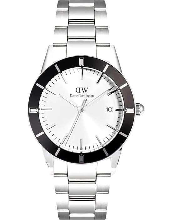 Daniel Wellington — мужские часы в современном спортивно-элегантном стиле. Круглый корпус диаметром 40 мм изготовлен из нержавеющей стали и дополнен чёрным безелемБезельВнешний ободок, закрепляющий стекло. В спортивных часах так называется поворотное кольцо с делениями на циферблате, выполняет роль таймера – замеряет отрезки времени на шкале. Неподвижный безель – элемент декора. Однонаправленно вращающийся безель на дайверских часах позволяет фиксировать моменты погружения и выныривания на поверхность. из анодированного алюминия, которое придаёт модели выразительный характер.