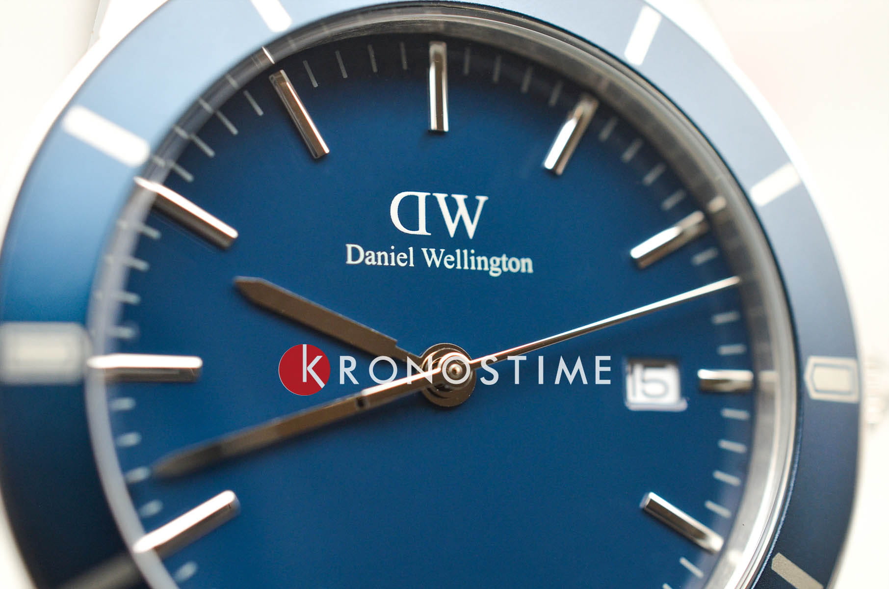 Daniel Wellington — мужские часы в современном спортивно-элегантном стиле. Круглый корпус диаметром 40 мм изготовлен из нержавеющей стали и дополнен синим безелемБезельВнешний ободок, закрепляющий стекло. В спортивных часах так называется поворотное кольцо с делениями на циферблате, выполняет роль таймера – замеряет отрезки времени на шкале. Неподвижный безель – элемент декора. Однонаправленно вращающийся безель на дайверских часах позволяет фиксировать моменты погружения и выныривания на поверхность. из анодированного алюминия, которое придаёт модели выразительный характер.