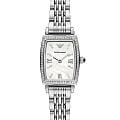Женские кварцевые часы Emporio Armani из серии Gianni T-Bar сочетают классический дизайн и высокую надёжность. Корпус выполнен из нержавеющей стали серебристого цвета и защищён минеральным стекломМинеральное стеклоМинеральное стекло представляет собой искусственно выращенный минерал кварца. Такое стекло отличается особой устойчивостью к повреждениям и царапинам. Уступает по некоторым качествам сапфировому стеклу.. Циферблат прямоугольной формы в серебристом цвете оформлен римскими цифрами, придающими модели элегантный и утончённый вид. Браслет из нержавеющей стали фиксируется на застёжке «бабочка» с кнопкамиЗастёжка "бабочка"Такой вид застёжки дополняется предохранителями, помогающими избежать случайного раскрытия браслета. Обладают изящным исполнением. , обеспечивая удобство и надёжность ношения. Часы оснащены японским кварцевым механизмом, гарантирующим точное отсчёт времени. Водонепроницаемость составляет 30 WR, что позволяет использовать их в повседневных условиях, защищая от случайных брызг и капель дождя. Модель подчёркивает женственность и стиль, идеально дополняя как повседневный, так и вечерний образ.