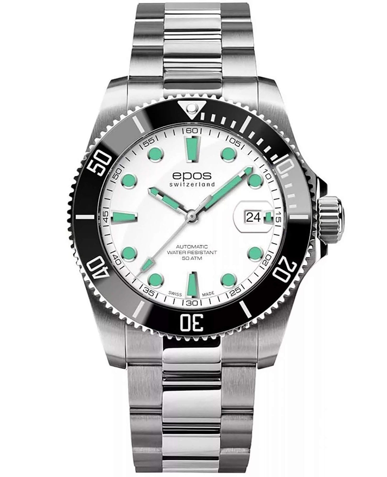 Мужские механические часы с автоподзаводом Epos из коллекции Diver - это профессиональный дайверский инструмент с швейцарским качеством. Корпус диаметром 42 мм и толщиной 14 мм выполнен из нержавеющей стали 316L. Циферблат белого цвета оформлен метками в виде точек и штрихов. Циферблат защищён сапфировым стекломСапфировое стеклоПрочный и надёжный материал из кристалла сапфира синтетического происхождения, характеризующийся особой твёрдостью и устойчивостью к царапинам и повреждениям.. Стрелки и метки с люминесцентным покрытиемЛюминесцентное покрытиеПозволяет считывать показания времени в темноте. Производители наносят на стрелки, часовые индексы, безель или поверхность циферблата светонакопительный состав, дающий холодное свечение., обеспечивающим отличную читаемость в темноте. Механизм — швейцарский калибр Sellita SW200 с запасом хода 38 часов. Окошко даты с увеличительным стеклом расположено в положении 3 часов. БезельБезельВнешний ободок, закрепляющий стекло. В спортивных часах так называется поворотное кольцо с делениями на циферблате, выполняет роль таймера – замеряет отрезки времени на шкале. Неподвижный безель – элемент декора. Однонаправленно вращающийся безель на дайверских часах позволяет фиксировать моменты погружения и выныривания на поверхность. — однонаправленный вращающийся, что обеспечивает безопасность при погружении. Завинчивающаяся коронка и автоматический гелиевый клапан позволяют использовать часы для глубоководных погружений. Часы оснащены стальным браслетом с раскладной застёжкойРаскладная застёжкаТакой тип застёжки используется только на браслетах из металла. Она никогда не раскрывается полностью, происходит разделение на 2 и более частей. Раскладывающая застёжка снизит вероятность потери часов к минимуму.. Водонепроницаемость 500 м соответствует требованиям для дайвинга. Гарантия — 24 месяца. Идеальный выбор для тех, кто ценит надёжность, точность и экстремальные испытания.
