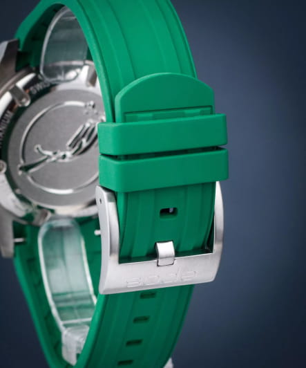 Мужские механические часы с автоподзаводом — это профессиональный дайверский инструмент с швейцарским качеством. Корпус диаметром 41,5 мм и толщиной 13,3 мм выполнен из титана с PVD-покрытиемPVDУльтратонкое покрытие наносится в технике вакуумного напыления, сочетает в себе нитрид титана особой прочности со слоем золота или оксида хрома. Несёт в себе декоративную или защитную функцию., что обеспечивает лёгкость и высокую прочность. Циферблат зелёного цвета оформлен контрастными метками и стрелками. Циферблат защищён сапфировым стекломСапфировое стеклоПрочный и надёжный материал из кристалла сапфира синтетического происхождения, характеризующийся особой твёрдостью и устойчивостью к царапинам и повреждениям.. Механизм — швейцарский калибр Sellita SW200. Окошко даты расположено в положении 3 часов. БезельБезельВнешний ободок, закрепляющий стекло. В спортивных часах так называется поворотное кольцо с делениями на циферблате, выполняет роль таймера – замеряет отрезки времени на шкале. Неподвижный безель – элемент декора. Однонаправленно вращающийся безель на дайверских часах позволяет фиксировать моменты погружения и выныривания на поверхность. — однонаправленный вращающийся. Завинчивающаяся коронка и автоматический гелиевый клапан позволяют использовать часы при глубоководных погружениях. Часы оснащены каучуковым ремешком зелёного цвета с стандартной застёжкой. Водонепроницаемость 500 м соответствует требованиям для профессионального дайвинга. Вес — 98 г. Гарантия — 24 месяца. Идеальный выбор для тех, кто ценит надёжность, точность и экстремальные условия.