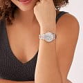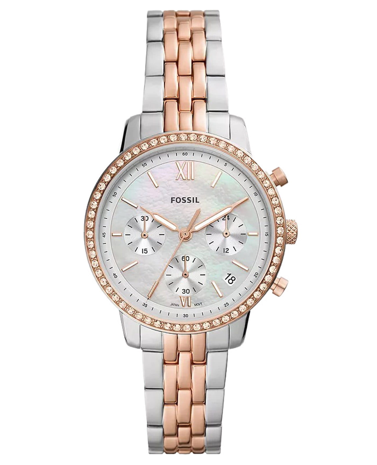 Женские американские часы-хронографХронографФункция позволяет измерять отрезки времени с особой точностью: часы, минуты, секунды. Верным признаком хронографа является наличие на циферблате 3 дополнительных окошек-счётчиков. с секундомеромСекундомерСекундоме́р — прибор, способный измерять интервалы времени с точностью до долей секунды. и с минеральным стекломМинеральное стеклоМинеральное стекло представляет собой искусственно выращенный минерал кварца. Такое стекло отличается особой устойчивостью к повреждениям и царапинам. Уступает по некоторым качествам сапфировому стеклу. Fossil Neutra ES5279, кварцевый механизм с высокой точностью. Корпус и браслет часов изготовлены из нержавеющей стали. БезельБезельВнешний ободок, закрепляющий стекло. В спортивных часах так называется поворотное кольцо с делениями на циферблате, выполняет роль таймера – замеряет отрезки времени на шкале. Неподвижный безель – элемент декора. Однонаправленно вращающийся безель на дайверских часах позволяет фиксировать моменты погружения и выныривания на поверхность. из нержавеющей стали с IP-покрытиемIP-покрытиеМетод ионного напыления. Демонстрирует повышенную устойчивость к истиранию, окислению и химическим веществам. Под воздействием высокого давления и температуры около 1500°C молекулы металла надёжно соединяются с частицами корпуса часов. украшен кристаллами. Окошко даты между 4 и 5 часами. Класс водозащиты: 50 метров, позволит защитить корпус от случайных брызг или капель дождя. Стальной браслет с частичным с IP-покрытиемIP-покрытиеМетод ионного напыления. Демонстрирует повышенную устойчивость к истиранию, окислению и химическим веществам. Под воздействием высокого давления и температуры около 1500°C молекулы металла надёжно соединяются с частицами корпуса часов. на раскладной застёжкеРаскладная застёжкаТакой тип застёжки используется только на браслетах из металла. Она никогда не раскрывается полностью, происходит разделение на 2 и более частей. Раскладывающая застёжка снизит вероятность потери часов к минимуму..