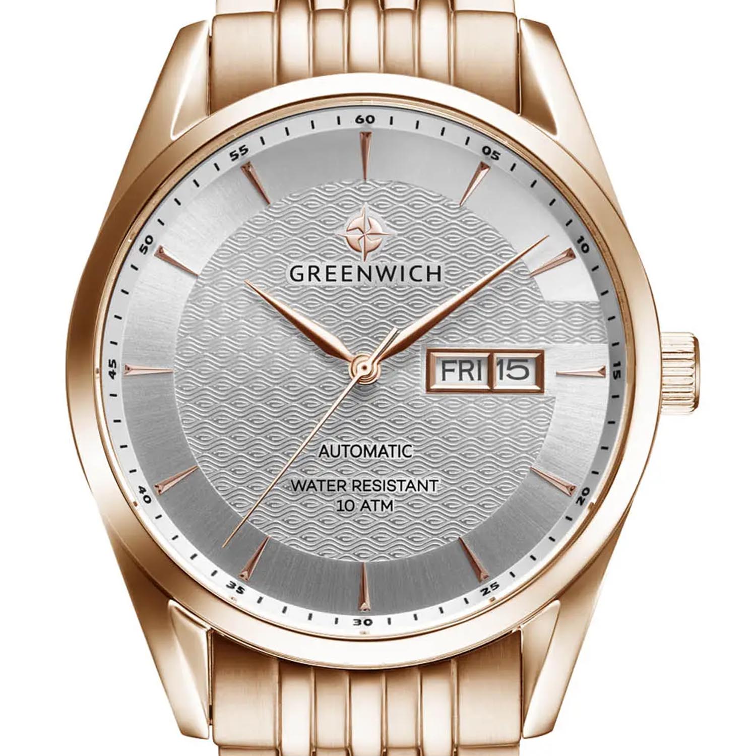 Мужские часы с минеральным стекломМинеральное стеклоМинеральное стекло представляет собой искусственно выращенный минерал кварца. Такое стекло отличается особой устойчивостью к повреждениям и царапинам. Уступает по некоторым качествам сапфировому стеклу. Greenwich Good Luck Classic GW 074.40.33, представляют собой классический вариант для повседневной носки. В центральной части циферблата — отличительная черта моделей этой серии: гильоше, объемные линии которого напоминают волны. Обратите внимание на форму пластины, где крепятся накладные риски: она сделана в форме латинской буквы G, первой буквы в названии бренда. Часы характеризуются традиционными формами, лаконичным исполнением, что делает модель элегантным дополнением к деловому костюму. Сквозь прозрачную заднюю крышку вы увидите детали механизма TMI с декорированным ротором: на нем выгравировано изображение символа английских моряков — парусника. Корпус, браслет и раскладная застёжкаРаскладная застёжкаТакой тип застёжки используется только на браслетах из металла. Она никогда не раскрывается полностью, происходит разделение на 2 и более частей. Раскладывающая застёжка снизит вероятность потери часов к минимуму. выполнены из гипоаллергенной нержавеющей стали с PVD-покрытиемPVDУльтратонкое покрытие наносится в технике вакуумного напыления, сочетает в себе нитрид титана особой прочности со слоем золота или оксида хрома. Несёт в себе декоративную или защитную функцию.. Дизайн, актуальный для любого современного образа, и надежность используемых материалов делают автоматические часы Greenwich удобным и стильным аксессуаром на каждый день. Окошко даты и дня недели находится в положении 3 часа. Класс водозащиты: 100 метров, позволит плавать, нырять и заниматься другими водными видами спорта.