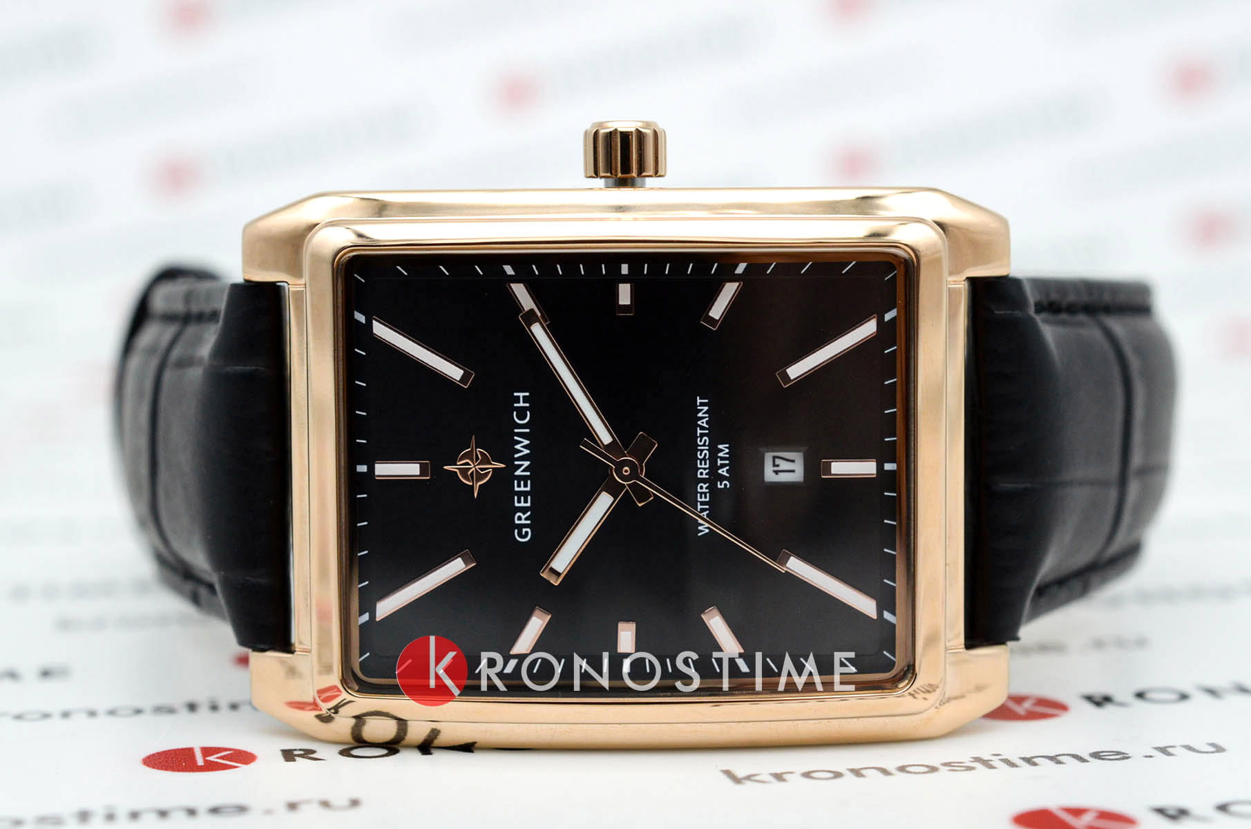 Часы Greenwich GW 571.41.11 из коллекции Galeon — элегантная мужская модель, сочетающая классический дизайн и современные технологии. Корпус размером 33 x 40 мм выполнен из гипоаллергенной нержавеющей стали с PVD-покрытиемPVDУльтратонкое покрытие наносится в технике вакуумного напыления, сочетает в себе нитрид титана особой прочности со слоем золота или оксида хрома. Несёт в себе декоративную или защитную функцию. из розового золота. Чёрный циферблат с крупными стрелками, покрытыми люминесцентным составом, защищён минеральным стекломМинеральное стеклоМинеральное стекло представляет собой искусственно выращенный минерал кварца. Такое стекло отличается особой устойчивостью к повреждениям и царапинам. Уступает по некоторым качествам сапфировому стеклу.. Окошко даты расположено в позиции «6 часов».