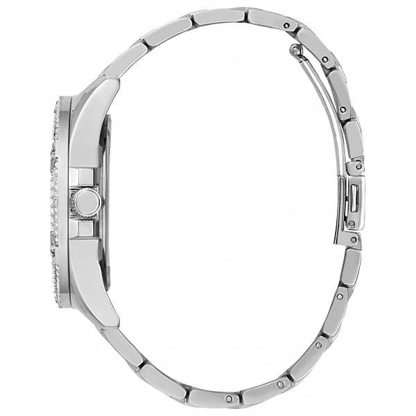 Женские наручные часы-скелетоны Guess Queen GW0464L1 с минеральным стекломМинеральное стеклоМинеральное стекло представляет собой искусственно выращенный минерал кварца. Такое стекло отличается особой устойчивостью к повреждениям и царапинам. Уступает по некоторым качествам сапфировому стеклу., кварцевый механизм с высокой точностью. Класс водозащиты: 30 метров, позволит защитить корпус от случайных брызг или капель дождя. Корпус часов изготовлен из стали. Браслет с раскладной застёжкойРаскладная застёжкаТакой тип застёжки используется только на браслетах из металла. Она никогда не раскрывается полностью, происходит разделение на 2 и более частей. Раскладывающая застёжка снизит вероятность потери часов к минимуму.. 12-ти и 24-х часовой формат времени, дата и день недели вынесены на отдельные циферблаты. Метки в виде штрихов. Рифленая заводная головка с защитой. Стрелки с люминесцентным покрытиемЛюминесцентное покрытиеПозволяет считывать показания времени в темноте. Производители наносят на стрелки, часовые индексы, безель или поверхность циферблата светонакопительный состав, дающий холодное свечение..
