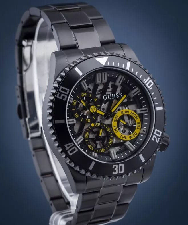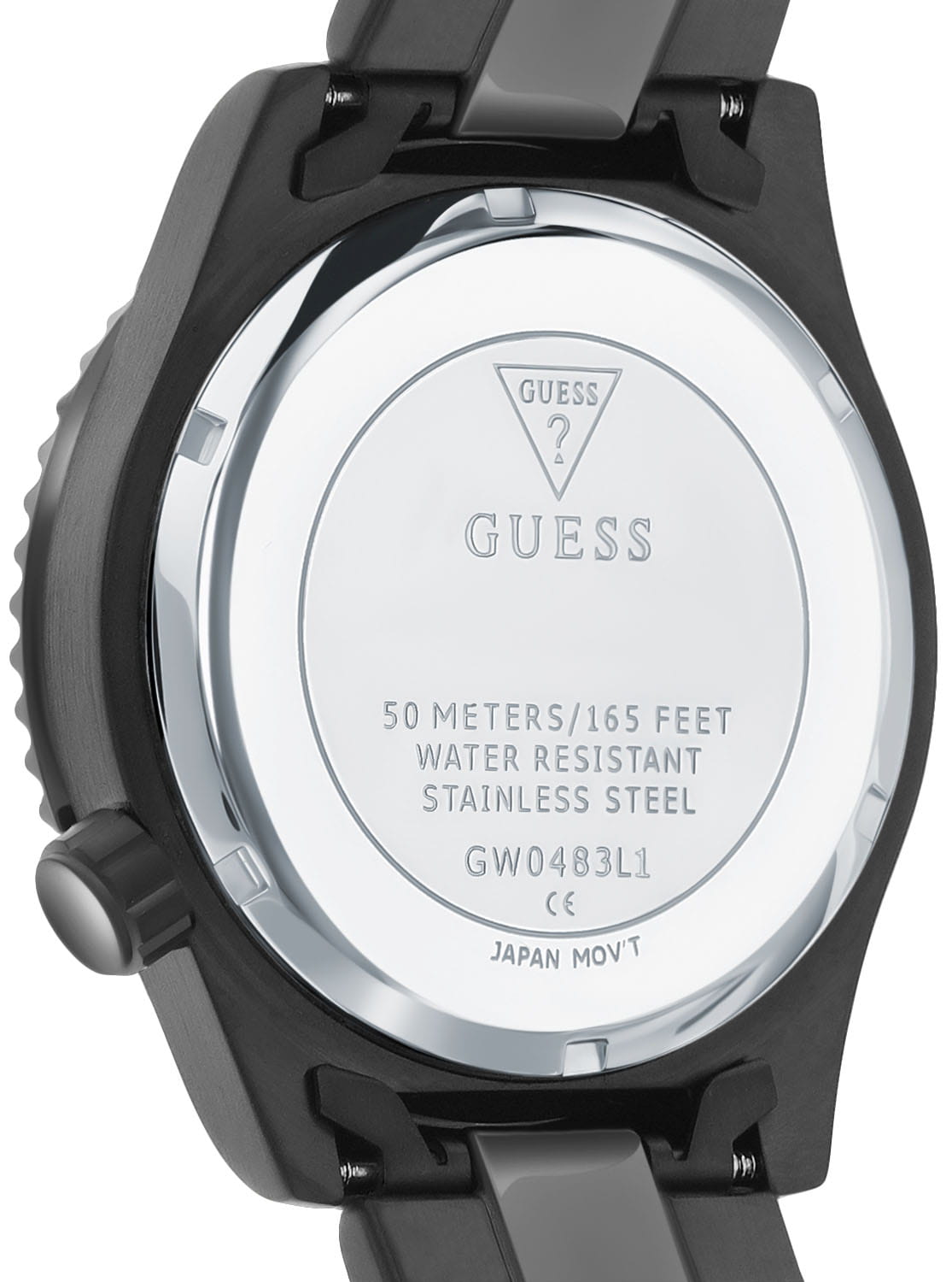 Мужские наручные часы с минеральным стекломМинеральное стеклоМинеральное стекло представляет собой искусственно выращенный минерал кварца. Такое стекло отличается особой устойчивостью к повреждениям и царапинам. Уступает по некоторым качествам сапфировому стеклу. Guess Axle GW0488G3, кварцевый механизм с высокой точностью. Класс водозащиты: 50 метров, позволит защитить корпус от случайных брызг или капель дождя. Корпус часов изготовлен из стали с IP-покрытиемIP-покрытиеМетод ионного напыления. Демонстрирует повышенную устойчивость к истиранию, окислению и химическим веществам. Под воздействием высокого давления и температуры около 1500°C молекулы металла надёжно соединяются с частицами корпуса часов.. Стальной браслет на раскладной застёжкеРаскладная застёжкаТакой тип застёжки используется только на браслетах из металла. Она никогда не раскрывается полностью, происходит разделение на 2 и более частей. Раскладывающая застёжка снизит вероятность потери часов к минимуму. с IP-покрытиемIP-покрытиеМетод ионного напыления. Демонстрирует повышенную устойчивость к истиранию, окислению и химическим веществам. Под воздействием высокого давления и температуры около 1500°C молекулы металла надёжно соединяются с частицами корпуса часов.. Стрелки с люминесцентным покрытиемЛюминесцентное покрытиеПозволяет считывать показания времени в темноте. Производители наносят на стрелки, часовые индексы, безель или поверхность циферблата светонакопительный состав, дающий холодное свечение.. 12-ти и 24-х часовой формат времени. Дата и день недели вынесены на отдельные циферблаты. Смещенная рифленая заводная головка с защитой.