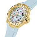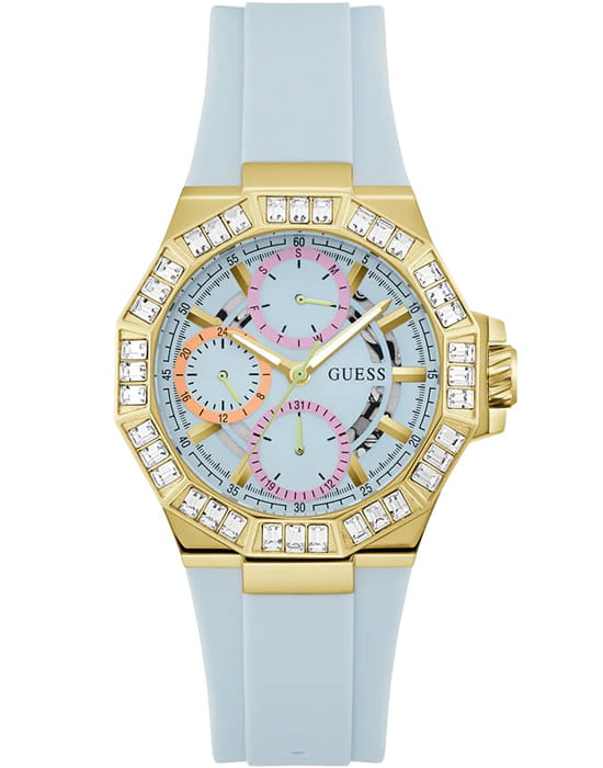 Женские наручные часы Guess GW0695L1 с минеральным стекломМинеральное стеклоМинеральное стекло представляет собой искусственно выращенный минерал кварца. Такое стекло отличается особой устойчивостью к повреждениям и царапинам. Уступает по некоторым качествам сапфировому стеклу., кварцевый механизм с высокой точностью. Корпус часов изготовлен из стали с IP-покрытиемIP-покрытиеМетод ионного напыления. Демонстрирует повышенную устойчивость к истиранию, окислению и химическим веществам. Под воздействием высокого давления и температуры около 1500°C молекулы металла надёжно соединяются с частицами корпуса часов.. Стрелки с люминесцентным покрытиемЛюминесцентное покрытиеПозволяет считывать показания времени в темноте. Производители наносят на стрелки, часовые индексы, безель или поверхность циферблата светонакопительный состав, дающий холодное свечение.. Класс водозащиты: 50 метров, позволит защитить корпус от случайных брызг или капель дождя. Силиконовый ремешок.