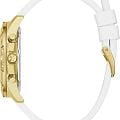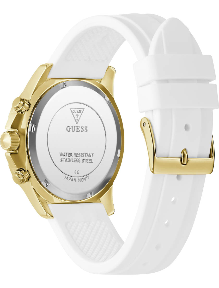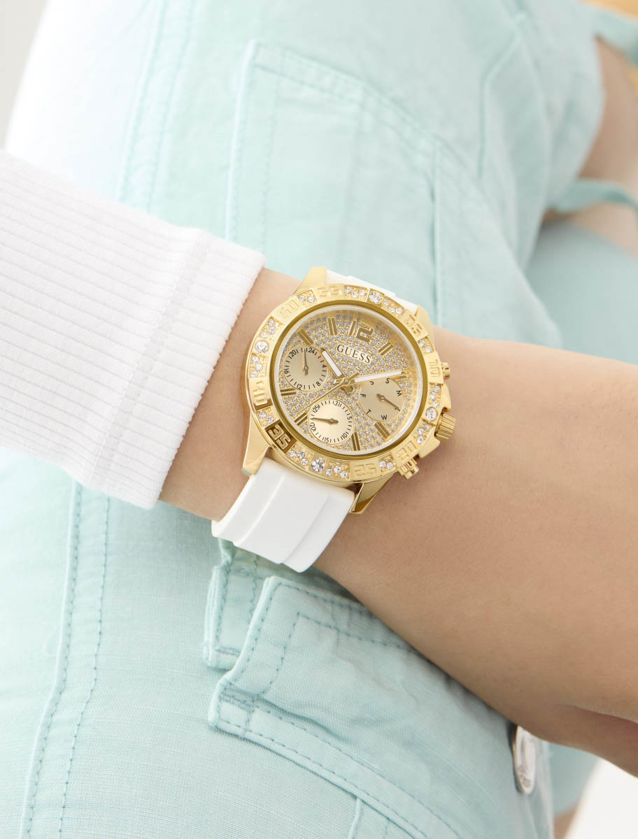 Женские наручные часы Guess Dress GW0771L2 с минеральным стекломМинеральное стеклоМинеральное стекло представляет собой искусственно выращенный минерал кварца. Такое стекло отличается особой устойчивостью к повреждениям и царапинам. Уступает по некоторым качествам сапфировому стеклу., кварцевый механизм с высокой точностью. Корпус часов изготовлен из стали с PVD-покрытиемPVDУльтратонкое покрытие наносится в технике вакуумного напыления, сочетает в себе нитрид титана особой прочности со слоем золота или оксида хрома. Несёт в себе декоративную или защитную функцию.. БезельБезельВнешний ободок, закрепляющий стекло. В спортивных часах так называется поворотное кольцо с делениями на циферблате, выполняет роль таймера – замеряет отрезки времени на шкале. Неподвижный безель – элемент декора. Однонаправленно вращающийся безель на дайверских часах позволяет фиксировать моменты погружения и выныривания на поверхность. с PVD-покрытиемPVDУльтратонкое покрытие наносится в технике вакуумного напыления, сочетает в себе нитрид титана особой прочности со слоем золота или оксида хрома. Несёт в себе декоративную или защитную функцию. украшен кристаллами. Стрелки с люминесцентным покрытиемЛюминесцентное покрытиеПозволяет считывать показания времени в темноте. Производители наносят на стрелки, часовые индексы, безель или поверхность циферблата светонакопительный состав, дающий холодное свечение.. Класс водозащиты: 50 метров, позволит защитить корпус от случайных брызг или капель дождя. Силиконовый ремешок с простой ремешковой застежкой.