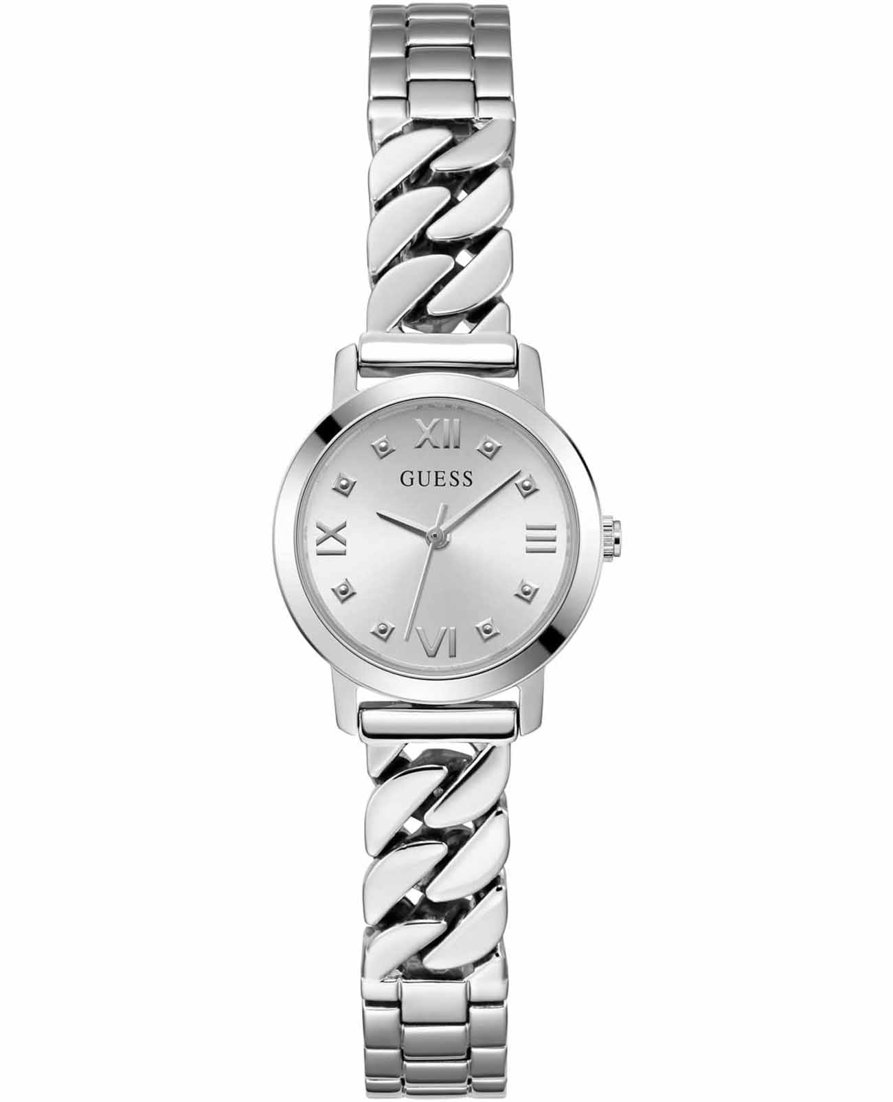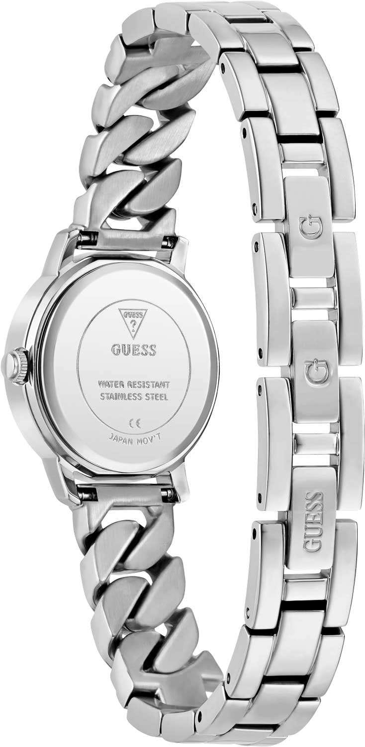 Часы Guess GW0867L1 — это уникальный аксессуар, который подчеркнет вашу индивидуальность и стиль, прекрасно дополняя как повседневный, так и вечерний образ. Эти женские часы оснащены надежным кварцевым механизмом, который гарантирует точность и долговечность. Круглый стальной корпус с полированной поверхностью, диаметром 25 мм и толщиной 8 мм, придает часам изысканный и современный вид. Серебристый циферблат, выполненный по технологии Sunray, украшен гильошированием в зоне меток и инкрустирован кристаллами, что создает эффект солнечных лучей. Метки в виде точек с кристаллами и римские цифры подчеркивают утонченность дизайна. Часы оснащены рифленой заводной головкой для удобного управления. Оригинальный стальной браслет с ювелирной застежкой  обеспечивает комфортное ношение и надежную фиксацию на запястье. Водозащита 30WR позволяет часам выдерживать случайные брызги, а минеральное стеклоМинеральное стеклоМинеральное стекло представляет собой искусственно выращенный минерал кварца. Такое стекло отличается особой устойчивостью к повреждениям и царапинам. Уступает по некоторым качествам сапфировому стеклу. защищает циферблат от царапин. Эти часы станут стильным и оригинальным дополнением для любого случая, подчеркивая вашу элегантность и современный стиль.