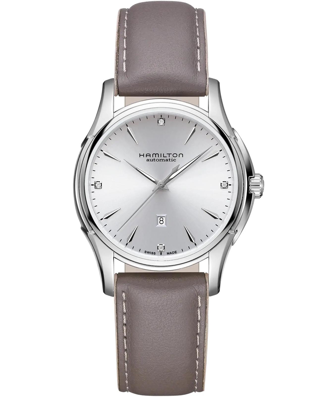 Женские швейцарские механические часы с автоматическим подзаводом Hamilton Jazzmaster Lady Auto H32315891. Корпус часов изготовлен из нержавеющей стали. Сапфировое стеклоСапфировое стеклоПрочный и надёжный материал из кристалла сапфира синтетического происхождения, характеризующийся особой твёрдостью и устойчивостью к царапинам и повреждениям. устойчивое к мелким механическим повреждениям. Кожаный ремешок на стандартной застёжке. Окошко даты находится в положении 6 часов. Стрелки и метки с люминесцентным покрытиемЛюминесцентное покрытиеПозволяет считывать показания времени в темноте. Производители наносят на стрелки, часовые индексы, безель или поверхность циферблата светонакопительный состав, дающий холодное свечение.. Циферблат инкрустирован бриллиантами. Класс водозащиты: 50 метров, позволит защитить корпус от случайных брызг или капель дождя.