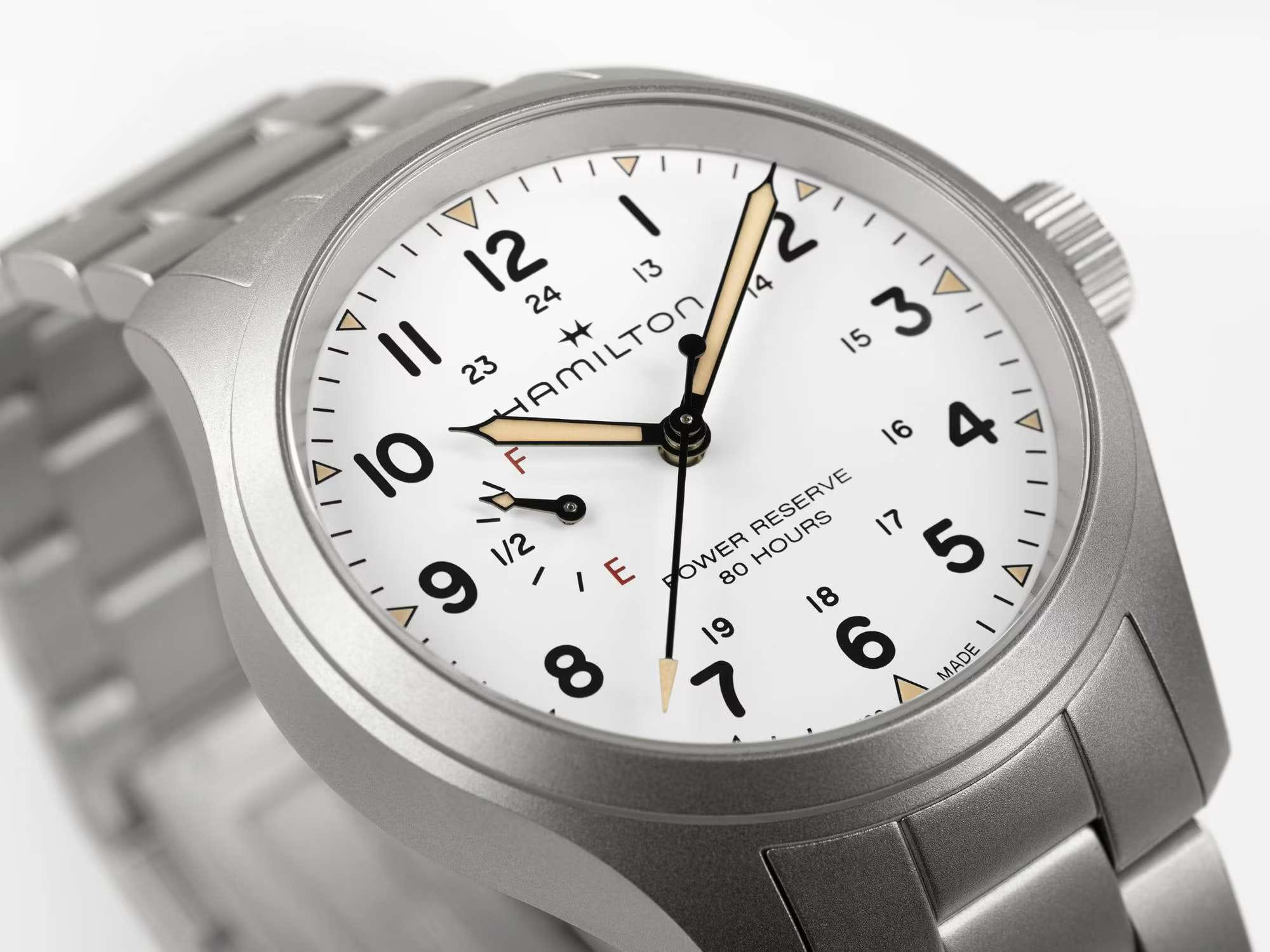 Мужские наручные часы Hamilton Khaki Field Mechanical Power Reserve 40mm H69509110 сочетают в себе спортивный стиль и элегантный дизайн. Модель обладает круглым корпусом диаметром 40 мм, изготовленным из нержавеющей стали, что обеспечивает высокую устойчивость к внешним воздействиям. Изысканный браслет выполнен из нержавеющей стали  с раскладной застёжкойРаскладная застёжкаТакой тип застёжки используется только на браслетах из металла. Она никогда не раскрывается полностью, происходит разделение на 2 и более частей. Раскладывающая застёжка снизит вероятность потери часов к минимуму., гарантирующей комфортное ношение и безопасность. Лаконичный циферблат оснащен крупными цифрами и стрелками с люминесцентным покрытиемЛюминесцентное покрытиеПозволяет считывать показания времени в темноте. Производители наносят на стрелки, часовые индексы, безель или поверхность циферблата светонакопительный состав, дающий холодное свечение. Super-LumiNova®, обеспечивающим превосходную видимость в темноте. Для защиты используется сапфировое стеклоСапфировое стеклоПрочный и надёжный материал из кристалла сапфира синтетического происхождения, характеризующийся особой твёрдостью и устойчивостью к царапинам и повреждениям., которое эффективно противостоит царапинам и имеет антибликовое покрытиеАнтибликовое покрытиеСлой оксида металла в 0,13-0,3 микрон, благодаря которому стекло часов не бликует и не отражает свет. Антибликовое покрытие уменьшает отражение света в 10 раз, обеспечивая отличную читаемость показателей циферблата.. Часы работают с помощью механизма H-23. На циферблате также буквы «F» для обозначения полного заряда и «E» для обозначения пустого заряда, что подчеркивает эту исключительную и практичную функцию. Водонепроницаемость часов достигает 10 атмосфер (100 метров), делающая их подходящими для повседневного использования и активного отдыха. Это сочетание высокой прочности, точности и изысканного дизайна для уверенных в себе мужчин.