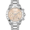 Элегантные женские часы Hugo Boss HB1502615 из коллекции Novia Sport Lux представлены в стальном корпусе диаметром 38 мм с эффектным розовым цифербалтом в технике Sunray, защищённым прочным минеральным стекломМинеральное стеклоМинеральное стекло представляет собой искусственно выращенный минерал кварца. Такое стекло отличается особой устойчивостью к повреждениям и царапинам. Уступает по некоторым качествам сапфировому стеклу.. Модель оснащена швейцарским кварцевым механизмом с полезными функциями: индикацией даты между 4 и 5 часами, вторым часовым поясомВторой часовой поясФункция, позволяющая отображать время двух часовых поясов одновременно. в 24-часовом формате и тахиметрической шкалойТахиметрРазмеченная шкала, располагается на ободке или безеле часов. Тахиметр позволяет рассчитать скорость на определённом участке пути, расстояние измеряется в километрах или милях.. Спортивный характер подчёркивает рифлёная заводная головка с защитой, а стальной браслет с раскладывающейся застёжкой обеспечивает комфортную посадку. Ударопрочная конструкцияУдаропрочный корпусМеханизм заключён в корпус, выполненный из современных материалов, устойчивых к ударам, механическим повреждениям и падению с высоты: инновационный пластик, карбон, нержавеющая сталь, титан. с водонепроницаемостью 50 метров делает часы устойчивыми к повседневным нагрузкам.
