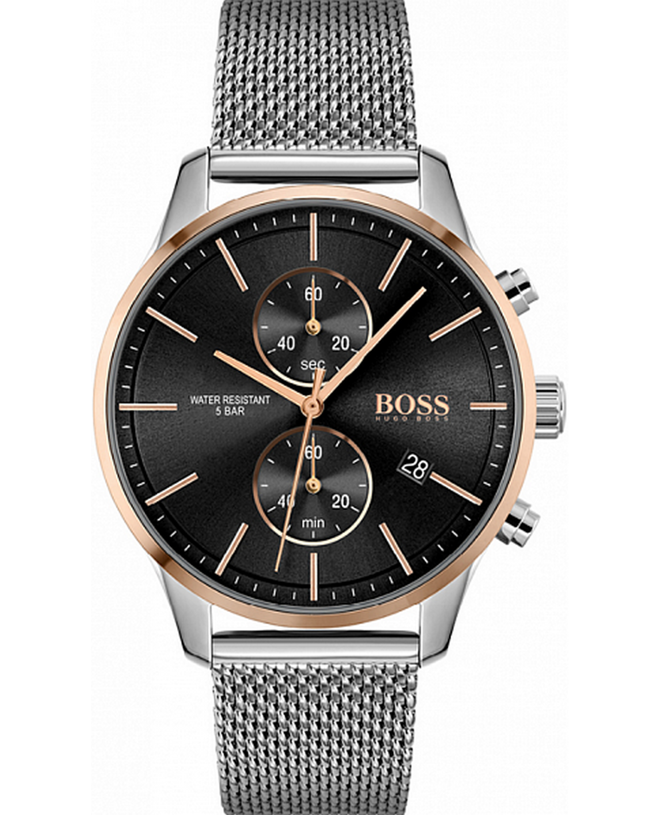 Мужские часы Hugo Boss Associate HB1513805 представлены в круглом 42-мм корпусе из нержавеющей стали с толщиной 9,9 мм. Оснащены кварцевым механизмом с функциями хронографаХронографФункция позволяет измерять отрезки времени с особой точностью: часы, минуты, секунды. Верным признаком хронографа является наличие на циферблате 3 дополнительных окошек-счётчиков., секундомеромСекундомерСекундоме́р — прибор, способный измерять интервалы времени с точностью до долей секунды. и индикацией даты на позиции 4 часа. Циферблат с подсветкой стрелок защищен устойчивым к царапинам минеральным стекломМинеральное стеклоМинеральное стекло представляет собой искусственно выращенный минерал кварца. Такое стекло отличается особой устойчивостью к повреждениям и царапинам. Уступает по некоторым качествам сапфировому стеклу.. Стальной браслет дополнен раскладной застёжкойРаскладная застёжкаТакой тип застёжки используется только на браслетах из металла. Она никогда не раскрывается полностью, происходит разделение на 2 и более частей. Раскладывающая застёжка снизит вероятность потери часов к минимуму. с фиксатором для надежной посадки. Водонепроницаемость 50 метров (5 ATM) обеспечивает защиту от брызг и дождя.