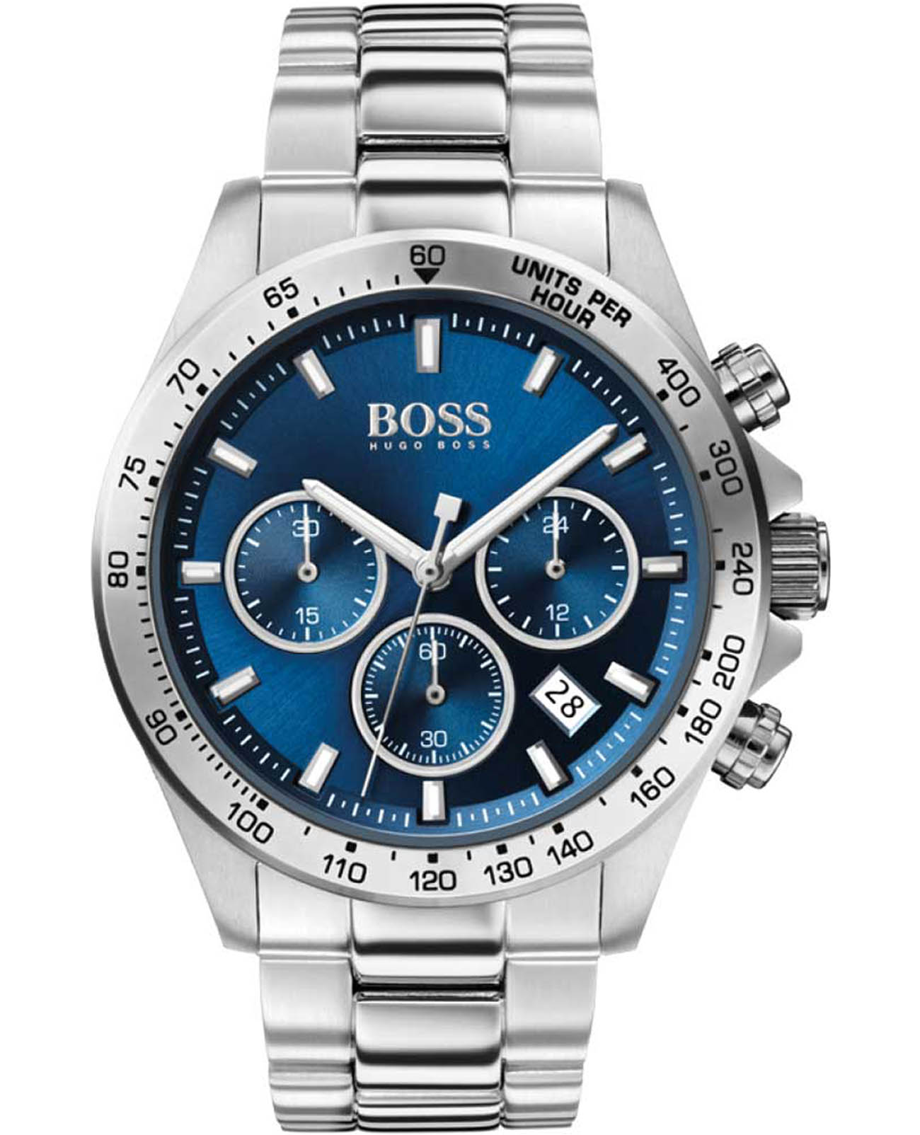 Мужские кварцевые часы Hugo Boss Hero HB1513755 представляют собой стильный хронографХронографФункция позволяет измерять отрезки времени с особой точностью: часы, минуты, секунды. Верным признаком хронографа является наличие на циферблате 3 дополнительных окошек-счётчиков. с круглым корпусом диаметром 43 мм из нержавеющей стали, дополненным синим циферблатом с серебристыми стрелками и штриховыми индексами для оптимальной читаемости. Модель оснащена высокоточным кварцевым механизмом с функцией хронографаХронографФункция позволяет измерять отрезки времени с особой точностью: часы, минуты, секунды. Верным признаком хронографа является наличие на циферблате 3 дополнительных окошек-счётчиков., включая 60-минутный счетчик и индикацию даты. Циферблат защищен устойчивым к царапинам минеральным стекломМинеральное стеклоМинеральное стекло представляет собой искусственно выращенный минерал кварца. Такое стекло отличается особой устойчивостью к повреждениям и царапинам. Уступает по некоторым качествам сапфировому стеклу., а водонепроницаемость 5 ATM (50 метров) обеспечивает защиту от брызг и дождя. Стальной браслет с раскладной застежкойРаскладная застёжкаТакой тип застёжки используется только на браслетах из металла. Она никогда не раскрывается полностью, происходит разделение на 2 и более частей. Раскладывающая застёжка снизит вероятность потери часов к минимуму. обеспечивает надежную посадку на запястье, а тахиметрическая шкалаТахиметрРазмеченная шкала, располагается на ободке или безеле часов. Тахиметр позволяет рассчитать скорость на определённом участке пути, расстояние измеряется в километрах или милях. на безеле позволяет производить расчеты скорости. Точность хода составляет ±15 секунд в месяц, что соответствует стандартам кварцевых механизмов. Дизайн модели сочетает спортивную функциональность с элегантным стилем, характерным для коллекции Hero.
